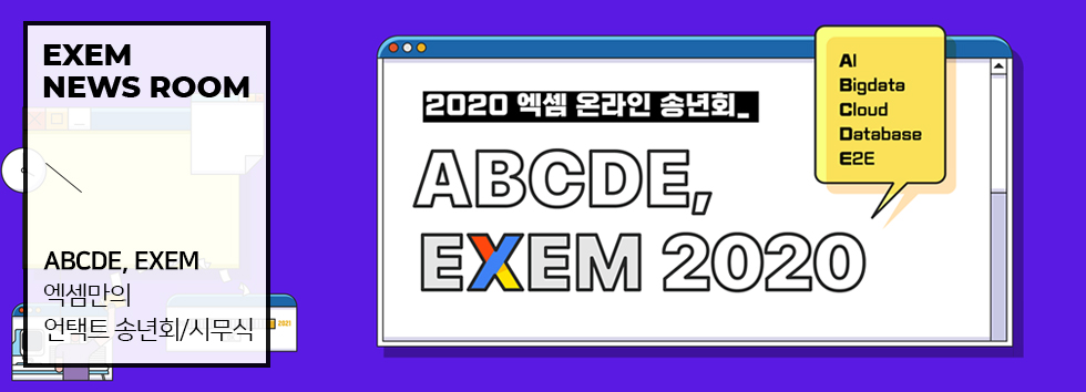 2020년은 엑셈의 20주년이기도 했습니다. (짝짝짝~👏) 20주년을 맞아 엑셈의 전 사업영역을 아우르는 내용으로 송년회 주제를 정했습니다. 바로 ‘ABCDE, EXEM’입니다. A부터 E까지 각각의 알파벳은 AI, Bigdata, Cloud, Database, E2E를 의미하며, 엑셈의 전문 영역을 직관적으로 나타냅니다.