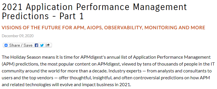 이와 같은 IT 성능 관리 시장의 세계적인 성장 추세에 발맞춰 엑셈도 2020년 전 사업부문에서 고른 매출 상승을 기록하며 2020년의 위기를 기회로 바꾸는 데 성공했다. 그 중심에 인터맥스의 맹활약이 있었다. 올해 더욱 기대되는 인터맥스의 광폭 행보를 살펴보기 전에 2021년에도 지속적으로 성장할 것으로 예상되는 전세계 및 국내 APM 시장에서 주목해야 할 트렌드를 몇 가지 소개한다. APM 중심으로 IT 성능 관리 업계 소식을 다루는 커뮤니티 블로그 ‘APMdigest’의 “2021 Application Performance Management Predictions”의 내용을 주로 참고했다. 애널리스트, 컨설턴트, 사용자, 글로벌 최고 벤더 등 APM 업계 전문가들이 APM과 연관 기술이 어떻게 발전하고 비즈니스에 영향을 줄 지 예측한 것이다.