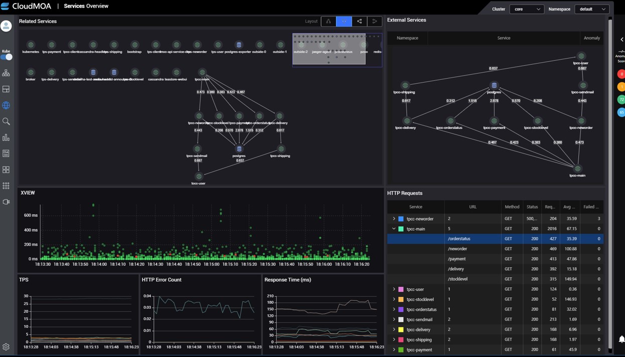 다차원 서비스 레벨 성능 모니터링 기능도 클라우드모아의 핵심 기능이다. MSA 환경의 복잡한 서비스 간 호출 관계와 트랜잭션 상세 흐름을 추적하고 분석하는 기능을 제공하고, 직관적인 UI·UX를 통해 장애 발생 컨테이너에 대한 빠른 탐색과 인지를 가능하게 한다.