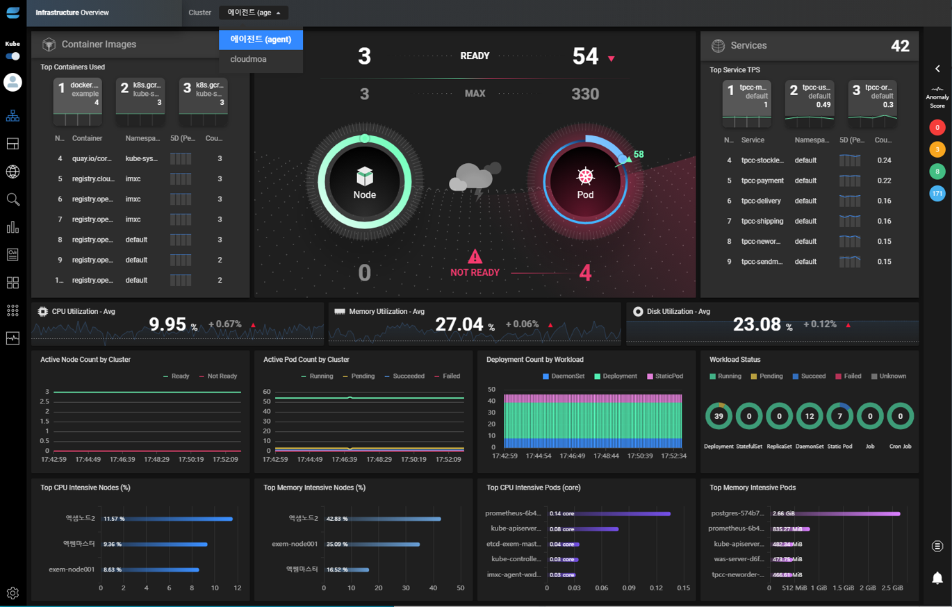 컨테이너 환경의 MSA 기반 애플리케이션 레벨의 서비스들에 대한 성능 지표를 쉽게 파악할 수 있는 ‘서비스 오버뷰(Services Overview)’ 화면을 신규로 개발하고, PaaS 플랫폼 환경의 다양한 인프라 관점의 성능 지표를 모니터링할 수 있는 ‘인프라스트럭처 오버뷰(Infrastructure Overview)’, 쿠버네티스 기반의 다양한 성능 지표를 모니터링할 수 있는 ‘워크로드 오버뷰(Workload Overview)’를 비롯해 고객사에서 가장 많이 보는 컨테이너/Pod 모니터링 화면 중 하나인 ‘워크로드 Pod별 상세 현황’ 화면을 개선했다.