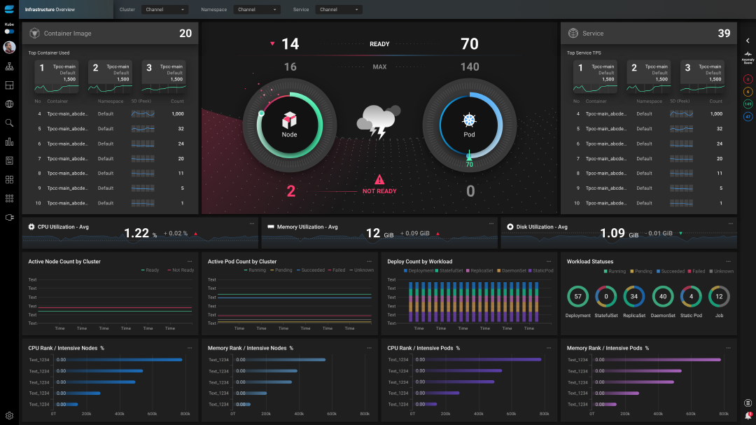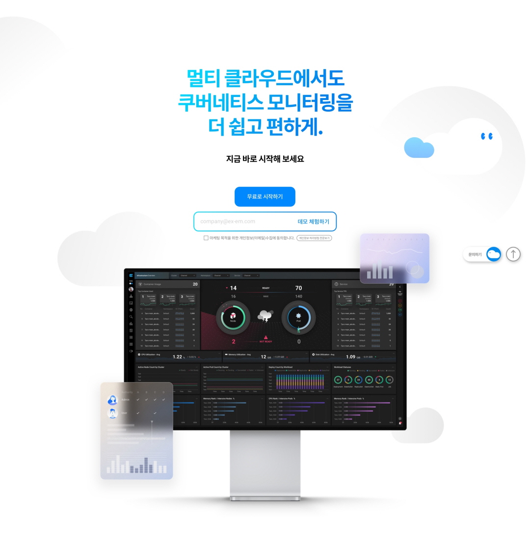 손쉬운 에이전트 설치 후 관제 대상 쿠버네티스 클러스터의 인프라와 워크로드의 운영 현황을 한눈에 파악할 수 있습니다. 관제 대상 클러스터의 노드와 파드의 상태 정보를 중심으로 워크로드 배포 현황, Top 리소스 사용량을 제공하여 전문 지식과 관계없이 장애 인지 및 효율적인 리소스 관리를 위한 커뮤니케이션이 가능합니다.