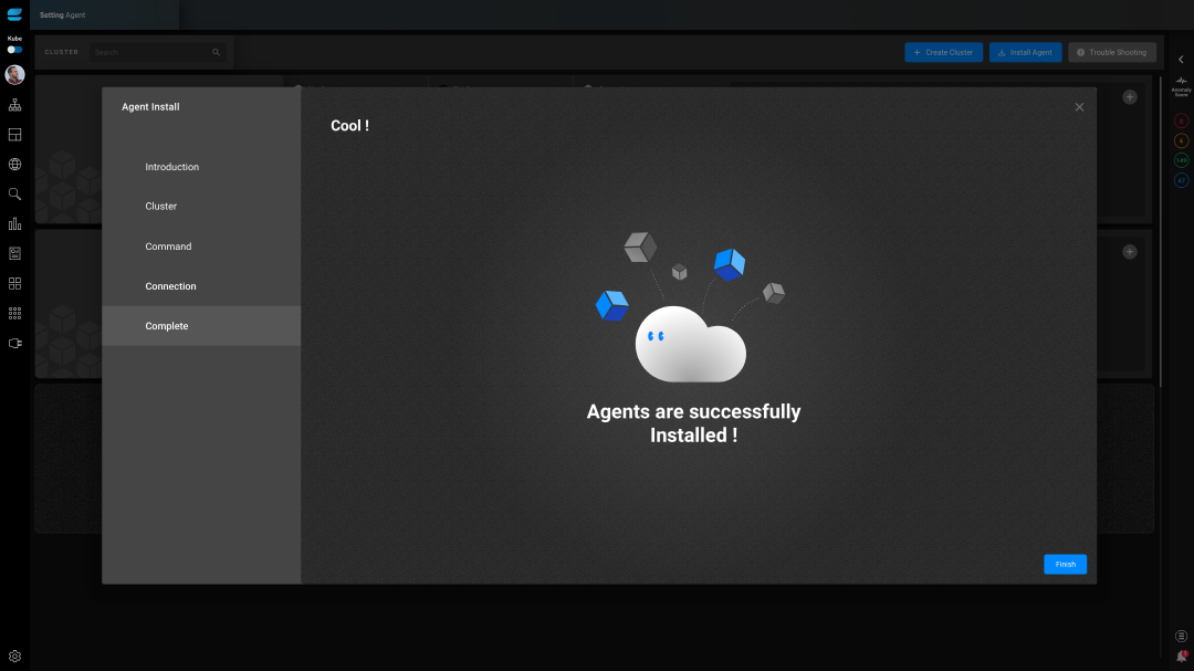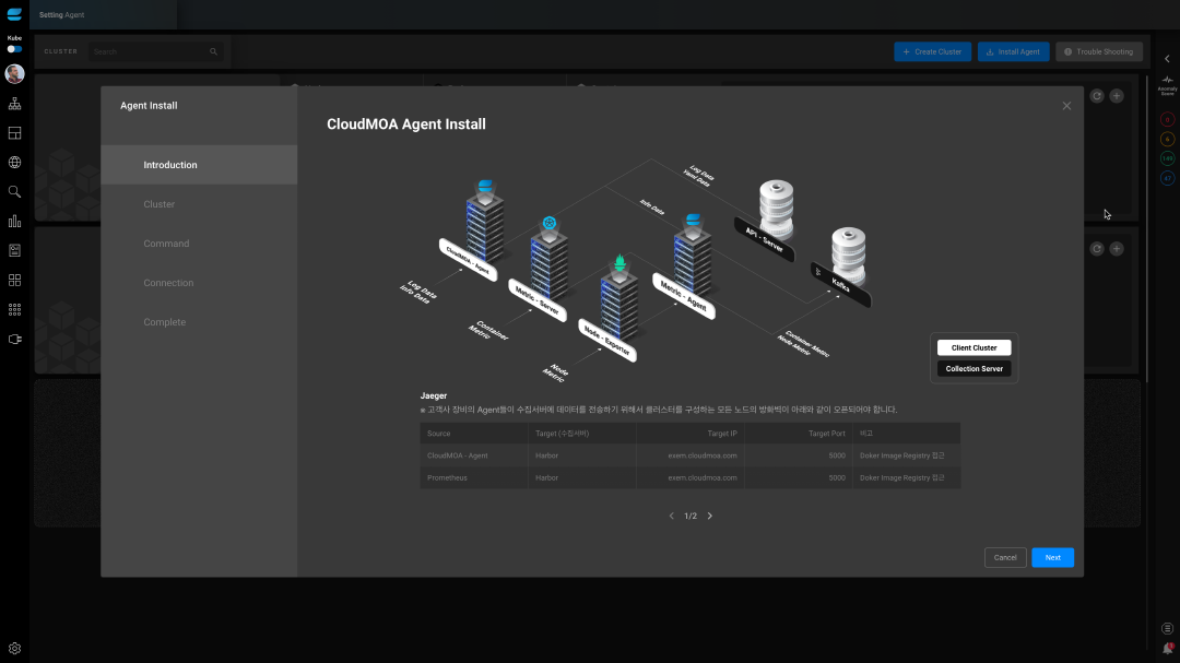 관제 대상 클러스터 관리 화면에서 에이전트 설치는 5단계로 이루어집니다.