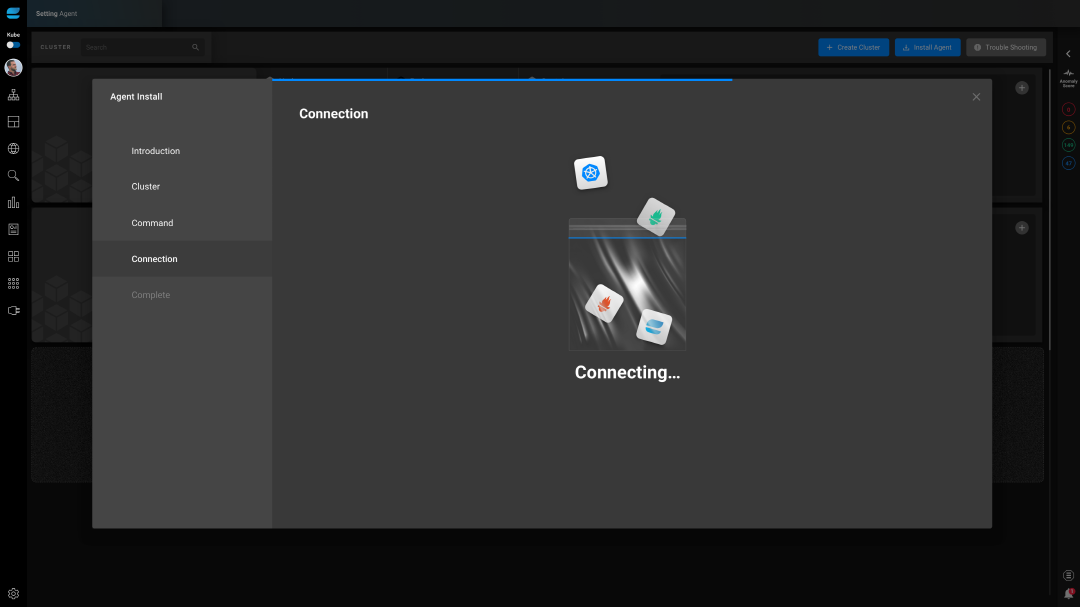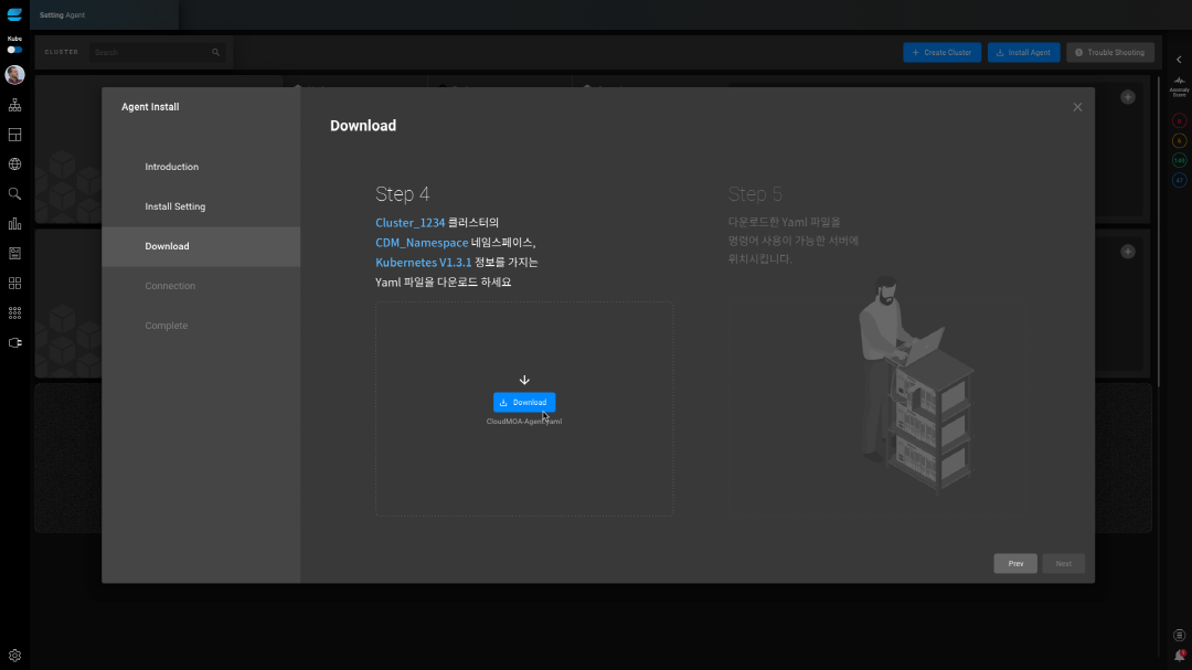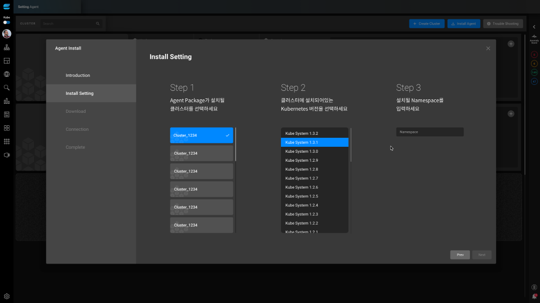 관제 대상 클러스터 관리 화면에서 에이전트 설치는 5단계로 이루어집니다.