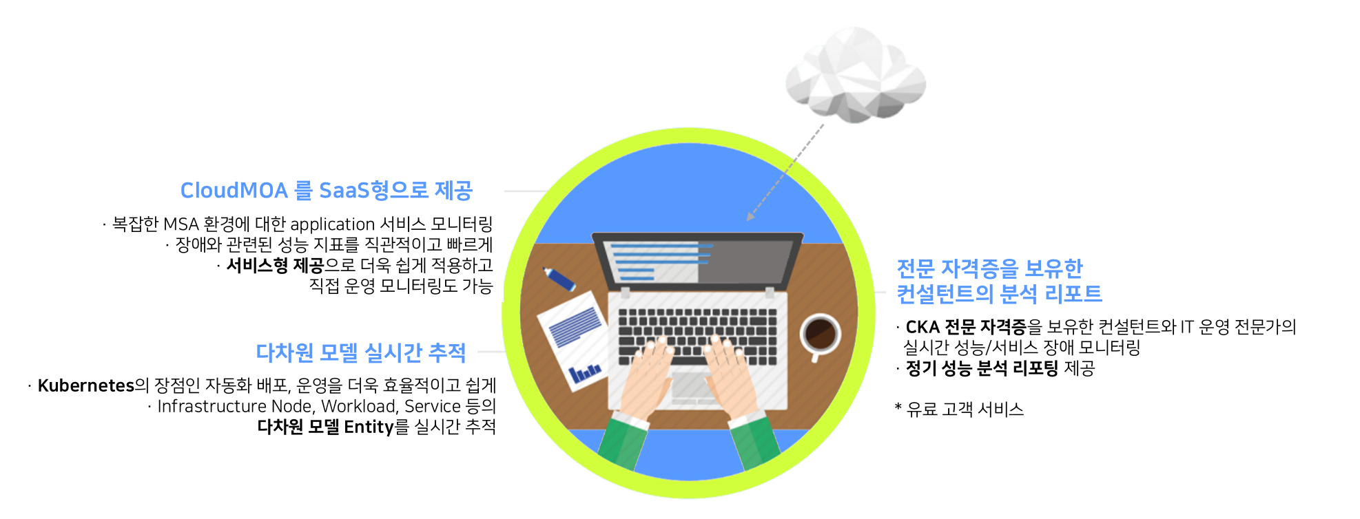CloudMOA SaaS는 엑셈의 첫 번째 SaaS로써, 쿠버네티스 기반 Service, Application, Database에 대한 모니터링을 서비스형(SaaS)으로 제공하는, 한 마디로 클라우드 환경 내 통합 관제가 가능한 솔루션입니다.