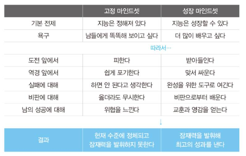 개인의 성공뿐만 아니라 집단의 성공은 성장 마인드셋을 가진 사람들이 얼마만큼 많은가에 달려있다고 해도 과언이 아니다. 이를 간단히 표로 정리하면 다음과 같다.