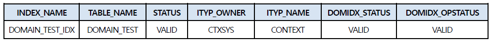 | << Context Index 생성 및 확인 >> -- TEST TABLE 생성 및 SQL_TEXT COLUMN에 대하여 CONTEXT INDEX 생성 CREATE TABLE DOMAIN_TEST AS SELECT SQL_TEXT FROM V$SQL; CREATE INDEX DOMAIN_TEST_IDX ON DOMAIN_TEST( SQL_TEXT ) INDEXTYPE IS CTXSYS.CONTEXT; -- TEST TABLE에 정상적으로 CONTEXT INDEX 생성 확인 SELECT INDEX_NAME , TABLE_NAME , STATUS , ITYP_OWNER , ITYP_NAME , DOMIDX_STATUS , DOMIDX_OPSTATUS FROM DBA_INDEXES WHERE INDEX_NAME ='DOMAIN_TEST_IDX'; ![]() |