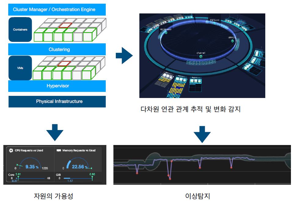 모니터링은 비즈니스의 연속성과 안정성, 그리고 신뢰성을 보장하기 위해 필요한 솔루션입니다. 지금까지 살펴본 IT 환경 변화는 분산된 인프라의 통합 관리와 공유 자원 풀링 등으로 시스템 및 애플리케이션 등의 데이터(메타, 메트릭 등의 Raw data)가 폭발적으로 늘어났으며, 대용량 데이터 실시간 수집 성능과 함께 메타 기반 상호 연관 관계 추적 및 변화 감지가 중요해졌습니다. 이는 On-Premise와 같은 싱글 포인트 장애 분석에서 다차원 관계에서 발생되는 장애 전파의 시작점(근본 원인)을 찾기 어려워졌기 때문입니다. 그리고 다운 타임과 복구 시간 단축을 위해 성능 데이터 기반 이상 탐지(Anomaly Detection), 사후 분석된 장애 패턴 기반의 데이터를 활용한 ML/AI 기반 분석 기능을 제공하는 솔루션 도입이 중요해졌습니다.
