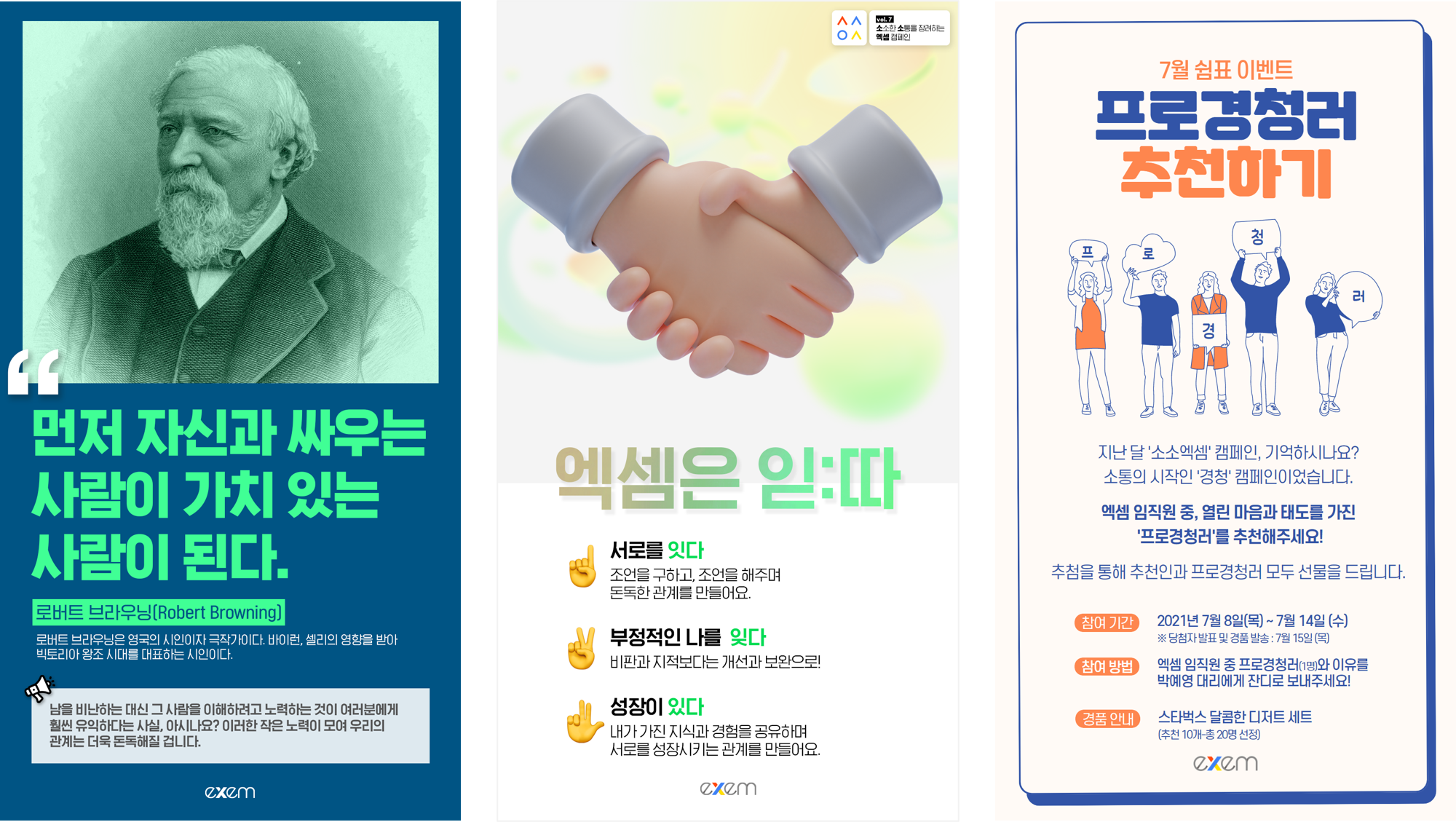 엑셈의 소통 활동들은 늘 신선한 활력소가 되어주는데요. 일주일 중 5일을 직장에서 보내는 우리, 직장에서의 삶이 즐거워야 삶이 행복하다고 말할 수 있겠죠? 모든 엑셈 임직원들이 행복하게 일하고, 그로 인해 더 높은 가치를 고객들에게 전달할 수 있도록 엑셈의 조직문화 활동은 쭈-욱 계속됩니다!