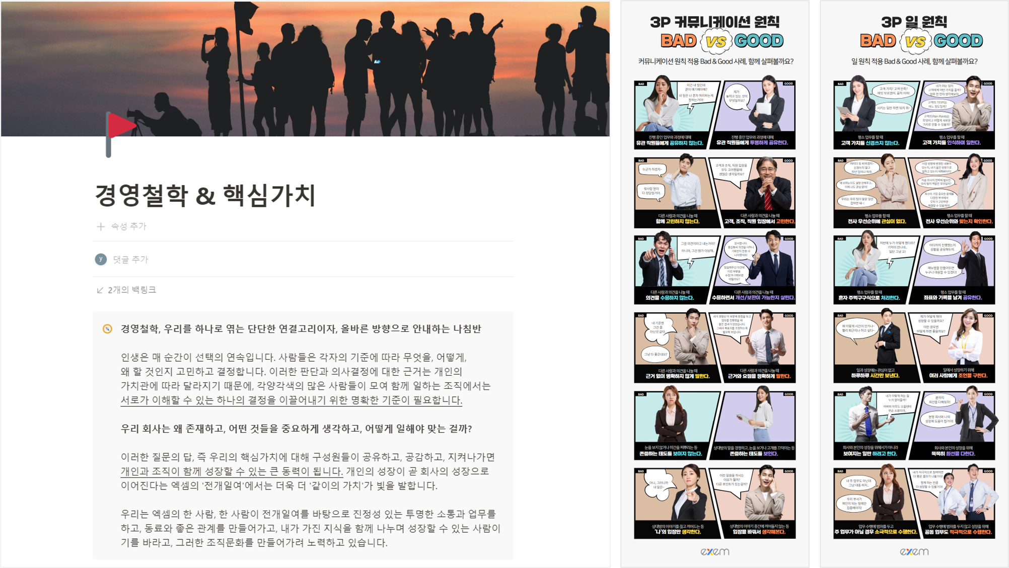 그리고 입사하면 받게 되는 '엑셈 가이드북'에는 언제든지 엑셈의 문화를 느끼고 찾아볼 수 있도록 정리된 페이지가 있고요, 사내 뉴스레터에는 생활 속에서 찾아볼 수 있는 3I, 3X, 3P 원칙 예시를 소개하고 있습니다. 이렇게 생활 속에서 만들어가는 작은 대화와 경험은 엑셈 구성원들이 하루하루를 즐겁게 보낼 수 있도록 합니다.