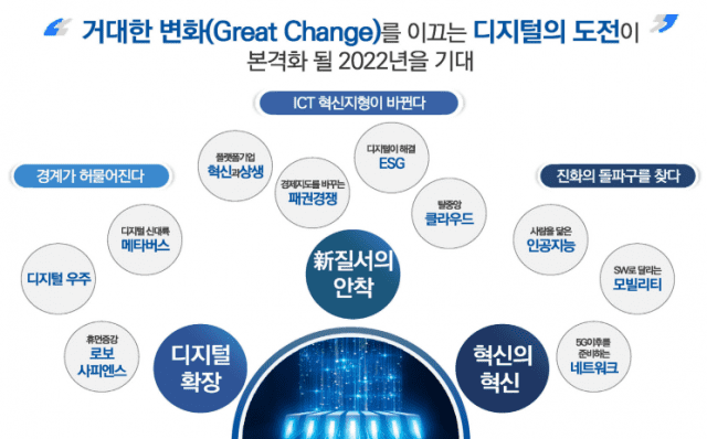 내년 2022년에는 메타버스, ESG 등을 중심으로 한 주요 ICT 분야가 핵심이 될 전망입니다. 지난 4일 '디지털 대전환, 혁신을 통한 미래!'라는 주제로 개최된 2022 ICT 산업전망컨퍼런스의 일부 내용을 정리해봤습니다.