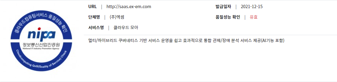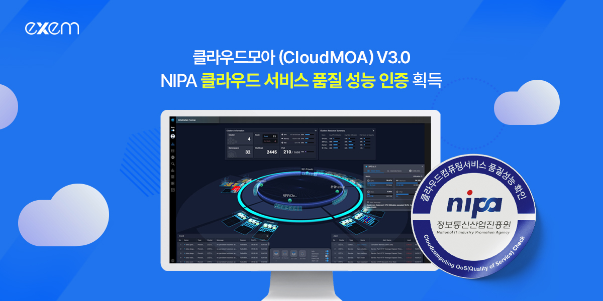 지난달, 클라우드 네이티브 아키텍처 통합관제 솔루션 클라우드모아(CloudMOA) SaaS 버전이 '클라우드 서비스 품질·성능 검증 인증'을 획득했습니다. 이로써 엑셈의 클라우드모아는 GS(Good Software)인증 1등급, 클라우드 서비스 품질·성능 검증 인증까지 ‘2관왕’을 달성했습니다.