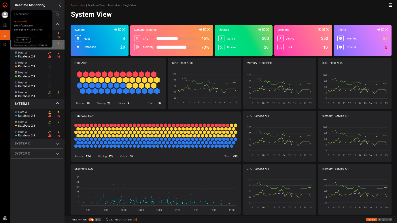 엑셈은 이번 출시한 ‘MaxGauge for HANA’에서 칼럼 스토어(Column-store) 기반 스케일 아웃(Scale-out) 구조의 HANA DB 아키텍처에 최적화된 모니터링 기술을 구현했다고 설명했다. 주요 기능은 ▲ CPU, 메모리, 디스크에 대한 사용량 등 SAP HANA 주요 KPI의 실시간 모니터링 및 추이 분석 ▲ 스레드, 세션, 트랜잭션 상태 정보 및 장기간 통계 분석과 탑다운(Top-down) 접근 방식을 통한 상세 분석 ▲ HANA DB가 제공하는 Table, CS Table 정보 분석 ▲ 비효율 SQL(Expensive SQL) 실시간 확인 및 수행 시간 분포 등 상세 분석 ▲ 디스크 볼륨 확인에 용이한 사용률 추이 분석 ▲ 운용 중인 HANA 시스템의 주요 파라미터(Parameter, 매개변수) 설정 및 변경 이력 제공 ▲ HANA DB 서비스와 호스트의 알람(Alert) 제공 및 SMS 연계 등으로 정밀한 분석 · 진단뿐 아니라 신속한 대응이 가능하다.