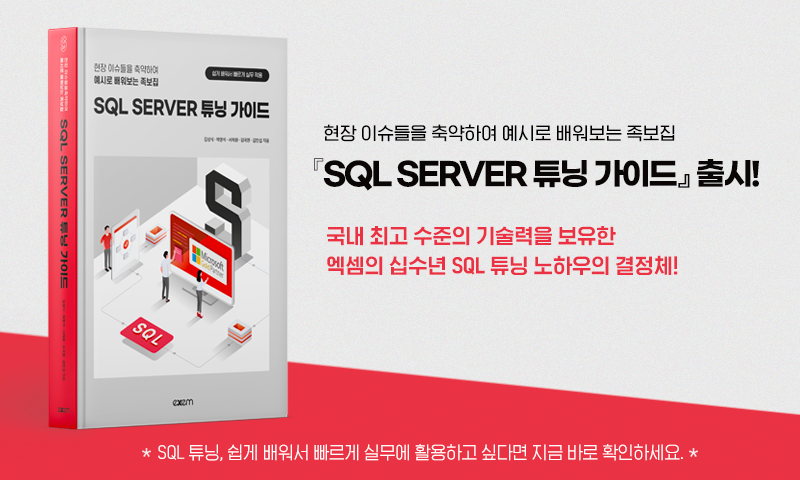 엑셈의 ‘SQL SERVER 튜닝 가이드’는 필수 이론을 포함해 현장에서 발생할 수 있는 다양한 이슈를 담아 실무에 필요한 SQL Server 튜닝 지식을 쏙쏙 얻어가실 수 있습니다. ‘SQL SERVER 튜닝 가이드’와 함께라면, 여러분의 SQL 튜닝 실력은 A+++!