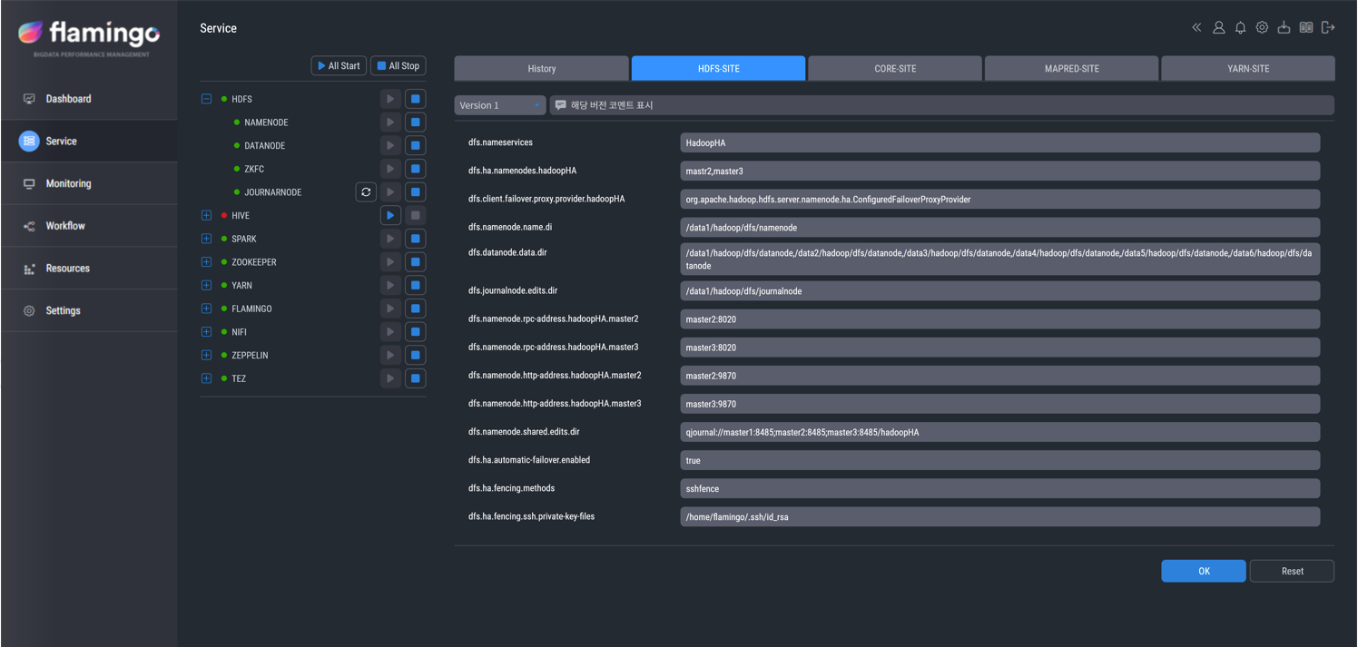 또한, 하둡 에코 시스템을 손쉽게 운영하기 위해 반드시 서비스 실행/종료 제어, 각 서브시스템의 설정 정보 변경 관리 등의 기능이 필요하다. 플라밍고는 이를 WEB UI 환경에서 관리할 수 있도록 하는 환경을 제공하고 있다. 서비스 실행/종료 시 서브시스템 간의 연관 관계에 따라 자동 순차 서비스 실행/종료가 되며 전체 서비스에 대한 일괄 실행/종료 기능도 제공한다. 운영 시 에코 시스템 설정에 대한 히스토리 관리를 통해 보다 안정적인 시스템 운영 및 처리가 가능하다.