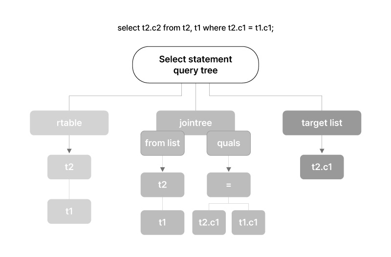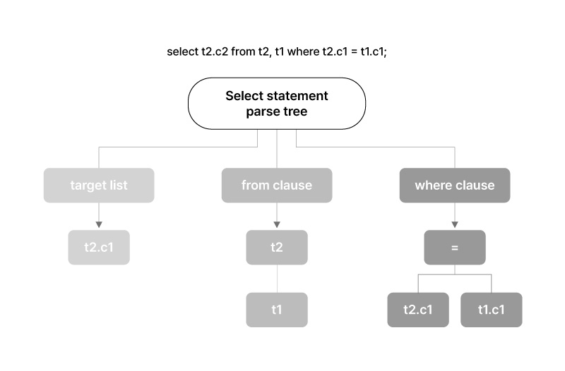 Parsing 단계는 SQL 처리과정의 첫번째 단계로 Query 구문을 분석하여 Syntax Error를 체크하고 Parse Tree를 생성합니다. 해당 단계에서는 System Catalog를 참조하지 않기 때문에 개별 요소들에 대한 의미분석(Semantic)이 불가하며 단순한 문법체크(Syntax)만을 수행합니다.