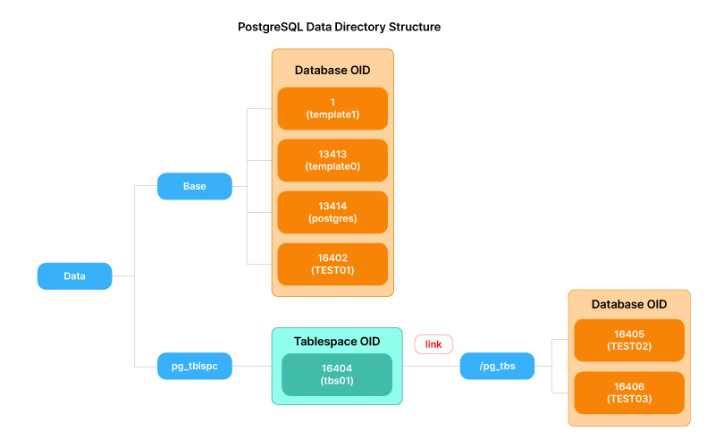 PostgreSQL의 Tablespace 정보를 저장하는 공간입니다. data 디렉토리가 아닌 다른 특정 디렉토리를 지정하여 Tablespace를 생성하면, 해당 디렉토리의 경로가 pg_tblspc 디렉토리에 생성된 심볼릭 링크를 통해 연결됩니다.