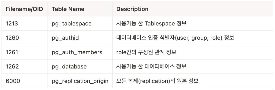 - Tablespace, Database, Role과 같이 여러 Database가 공통으로 사용하는 Data를 가지고 있는 파일입니다. 아래표는 대표적인 OID(Object ID)와 테이블명을 Mapping한 내용입니다.