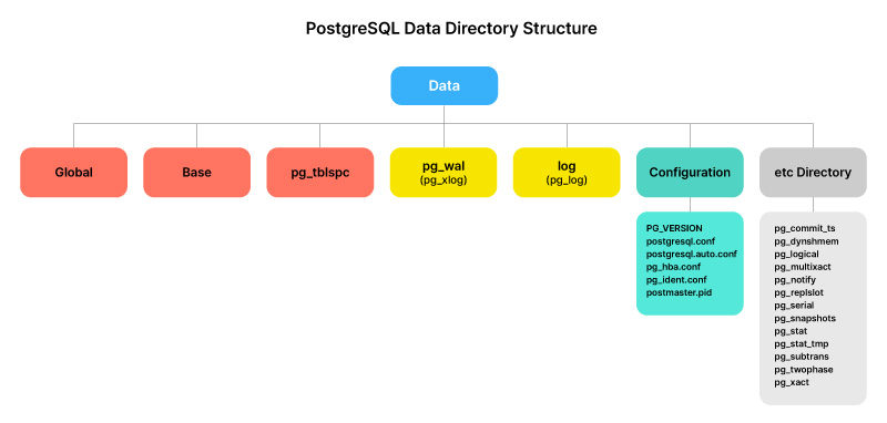 일반적으로 Database Cluster의 구성요소는 data 디렉토리 하위에 위치하고 있습니다. Database Cluster 초기화(initDB)시 지정된 위치에 data 디렉토리가 생성되며, 해당 디렉토리 밑으로 다양한 디렉토리 및 파일이 추가됩니다.