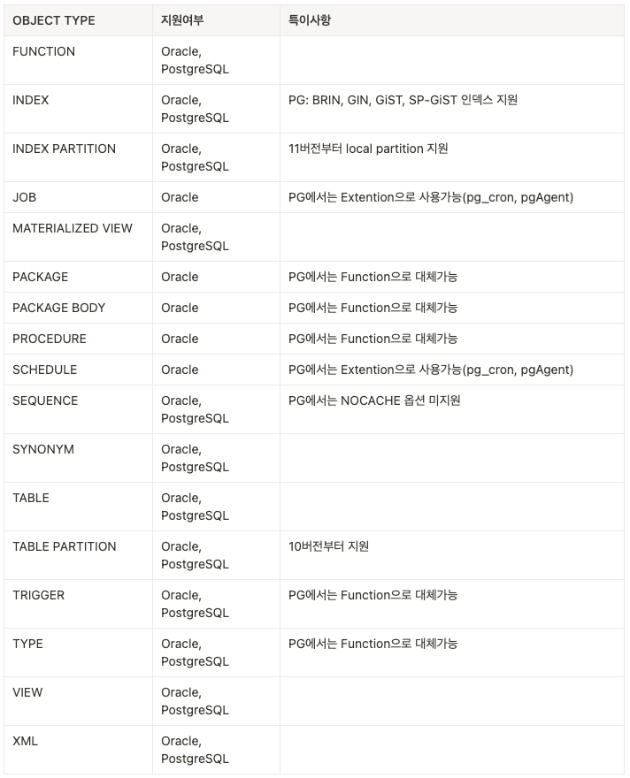 Object는 Data를 저장하거나 참조하는데 사용되는 데이터 구조를 말합니다. 우리에게 익숙한 테이블(Table), 인덱스(Index), 프로시저(Stored Procedure), 시퀀스(Sequence), 뷰(View) 등이 여기 포함됩니다. 아래 표를 통해 Oracle에서 주로 사용되는 Object와 비교 가능합니다.