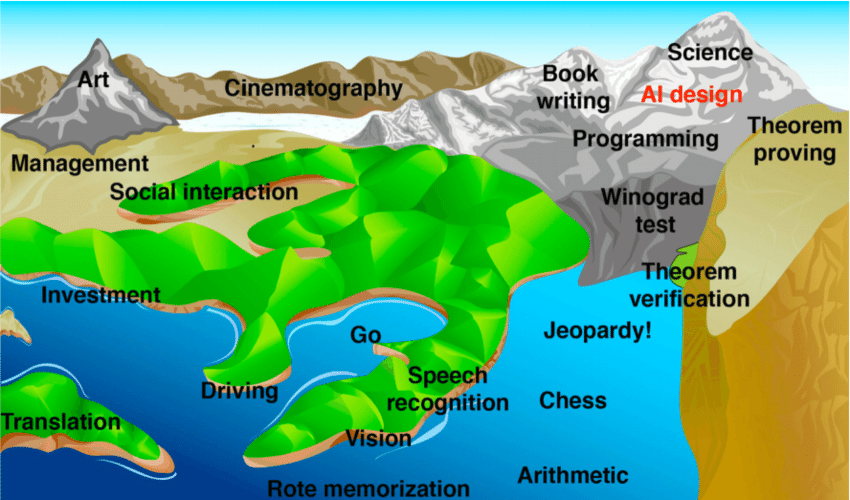 아래 그림은 한스 모라벡 교수가 말한 '인간 능력의 지형도'를 막스 테그마크(Max Erik Tegmark, 1967~)가 『라이프 3.0』에서 표현한 것입니다. 고도가 높아질수록 인공지능에게 어려워짐을 뜻합니다. 이 그림은 마치 지구 온난화로 상승하는 해수면을 떠올리게 합니다. 인공지능의 성능이 올라간다는 것은 해수면이 점점 올라가는 것과 같습니다. 인간의 암기, 계산의 능력은 진작 침수된 지 오래고 번역, 운전, 언어 인식, 바둑/체스 게임, 제퍼디(Jeopardy, 미국 장수 퀴즈쇼)와 같은 영역에서도 인간은 컴퓨터에게 자리를 내준지 이미 오래입니다. 최근엔 자본 투자나 의료 행위, 학문적 이론과 사법 판례의 확인 등 인간이 행하는 고난도의 작업에서도 효율과 정확도를 높이기 위해 인공지능의 도움을 받는 사례와 빈도가 점점 높아지고 있습니다.