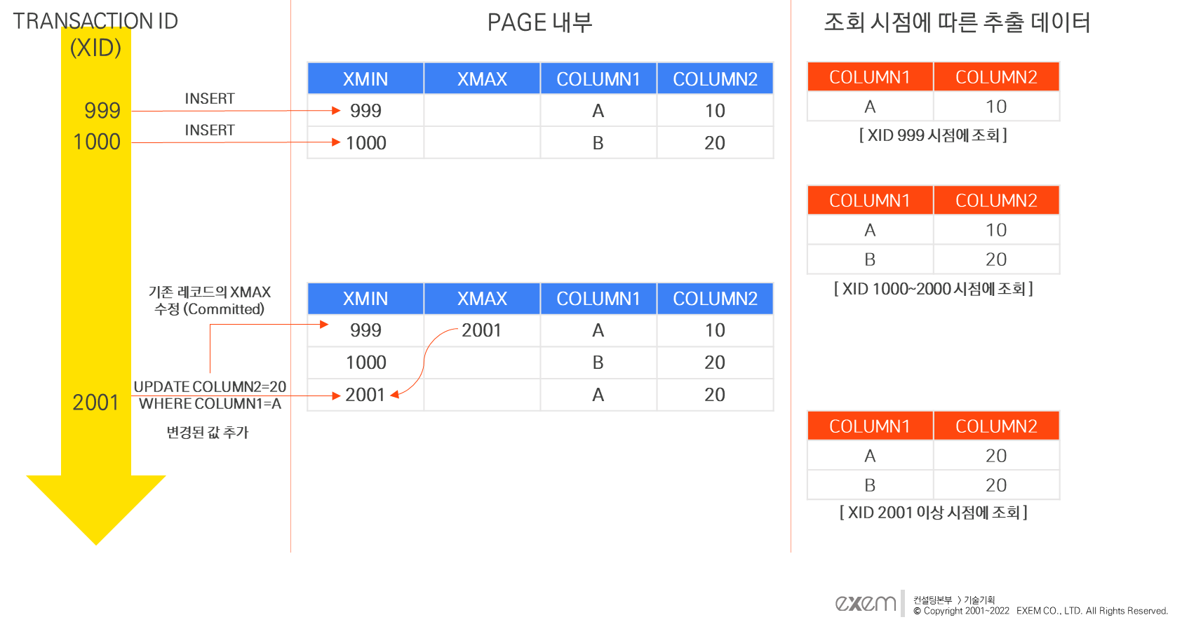 3. 수행 시점의 Transaction ID와 레코드의 XID (XMIN) 비교를 통해 MVCC를 구현합니다.