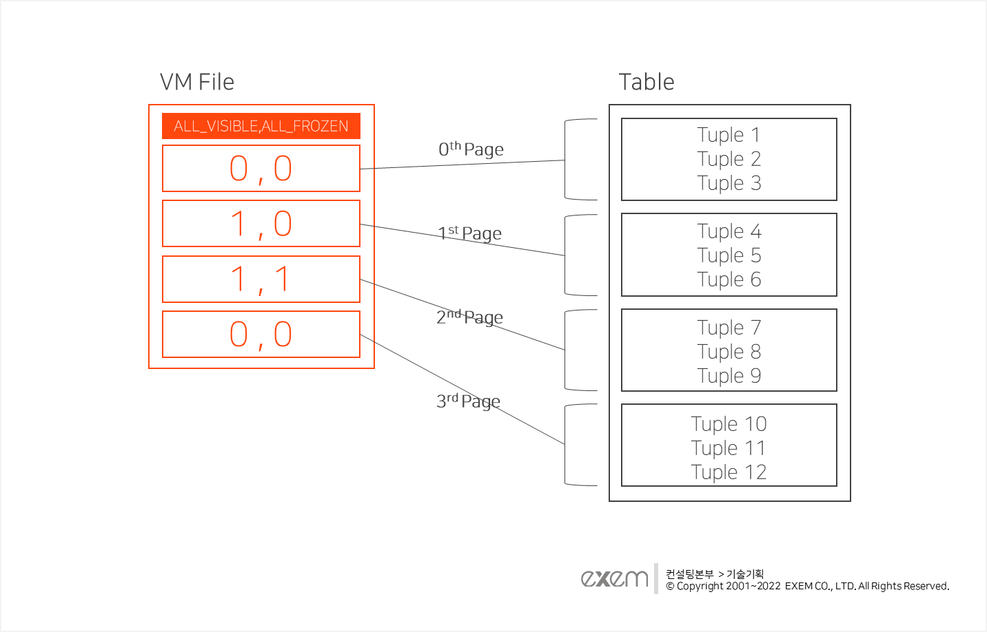 VM이란 Heap Relation(*테이블)을 구성하는 개별 페이지의 상태를 2개의 Bit값으로 표현하는 메타정보 파일이며 페이지가 포함하는 Tuple(Row)들의 상태 정보를 축약해서 담고 있습니다.