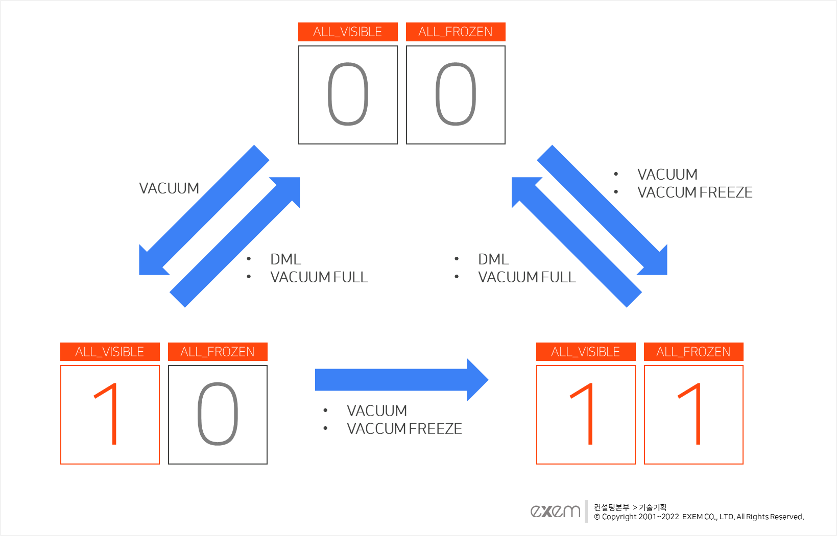 pg_visibility를 통해 관찰 가능한 VM의 2 Bit값은 DML 및 Vacuum 관련 작업 시 아래 그림과 같이 변화하며, 아래와 같은 특징을 갖습니다.