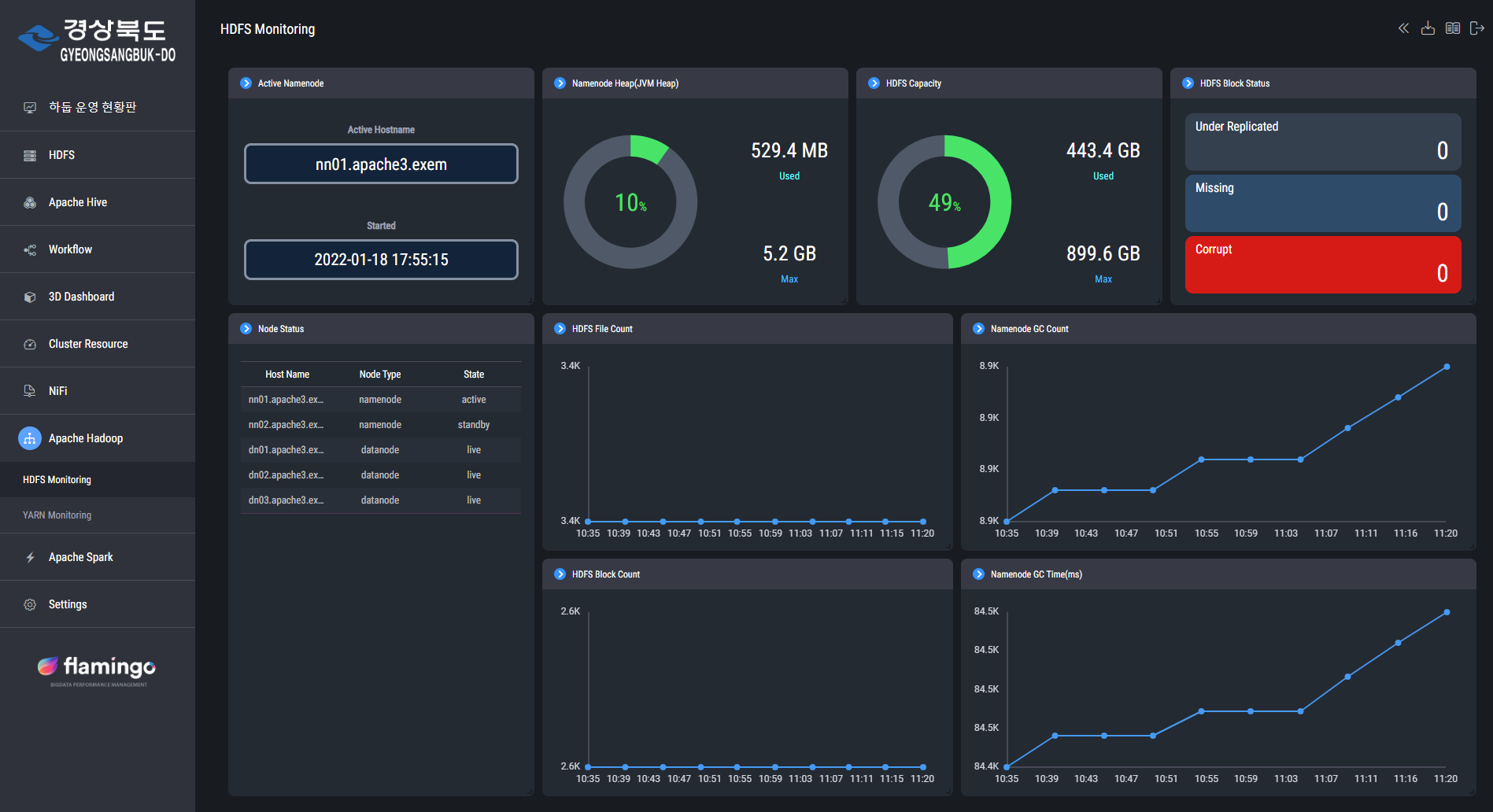 EBIGS는 ‘플라밍고 v3.0’를 통해 v2.0에서 제공하던 빅데이터 환경의 강력한 모니터링 기능과 더불어 운영자 편의 기능으로 하둡 에코 시스템 운영의 번거로움과 수고를 대폭 줄여준다. 운영자가 하둡 에코시스템을 구성하는 수많은 서버에 일일이 접속해 상태 확인 명령어를 실행할 필요 없이 간편한 운영과 장애 대응이 가능하도록 한다. 운영자는 각종 모니터링 뷰와 3D 대시보드를 통해 서버 리소스 현황과 소프트웨어의 상태 정보 등을 직관적으로 쉽게 확인할 수 있을 뿐만 아니라, 전체 서비스에 대한 일괄 실행 및 종료, 연관 관계에 있는 서비스 자동 순차 실행 및 종료 기능 등을 통해 하둡 에코 시스템을 쉽고 안정적으로 운영할 수 있다.