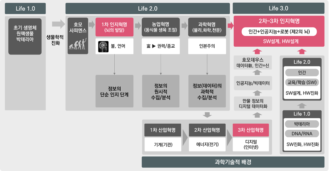 현재 우리 인간은 지능이 생명체 만이 가질 수 있는 고유한 것이라는 통념이 깨진, 물질이 지능을 얻고, 지능을 통해 물질이 문제를 해결하는 시대에 살고 있습니다. 우리 인간(라이프2.0)은 초기 생명체(라이프1.0)에서 진화를 거듭한 끝에 소프트웨어(지능, 인지)를 하늘로부터 부여받아 수만 년에 걸쳐 인지혁명과 농업혁명, 과학혁명 그리고 산업혁명을 거치며 문명의 꽃을 피워 왔습니다. 21세기 초엽인 현재, 인간은 데이터 혁명과 인공지능(AI)을 통해 생물학적 진화의 제약을 넘어서 자신의 소프트웨어(지능, 인지)와 하드웨어(몸, 신체)를 스스로 설계하고 개선하는 또다른 생명체(라이프3.0)로의 변화와 도약을 준비하고 있습니다.