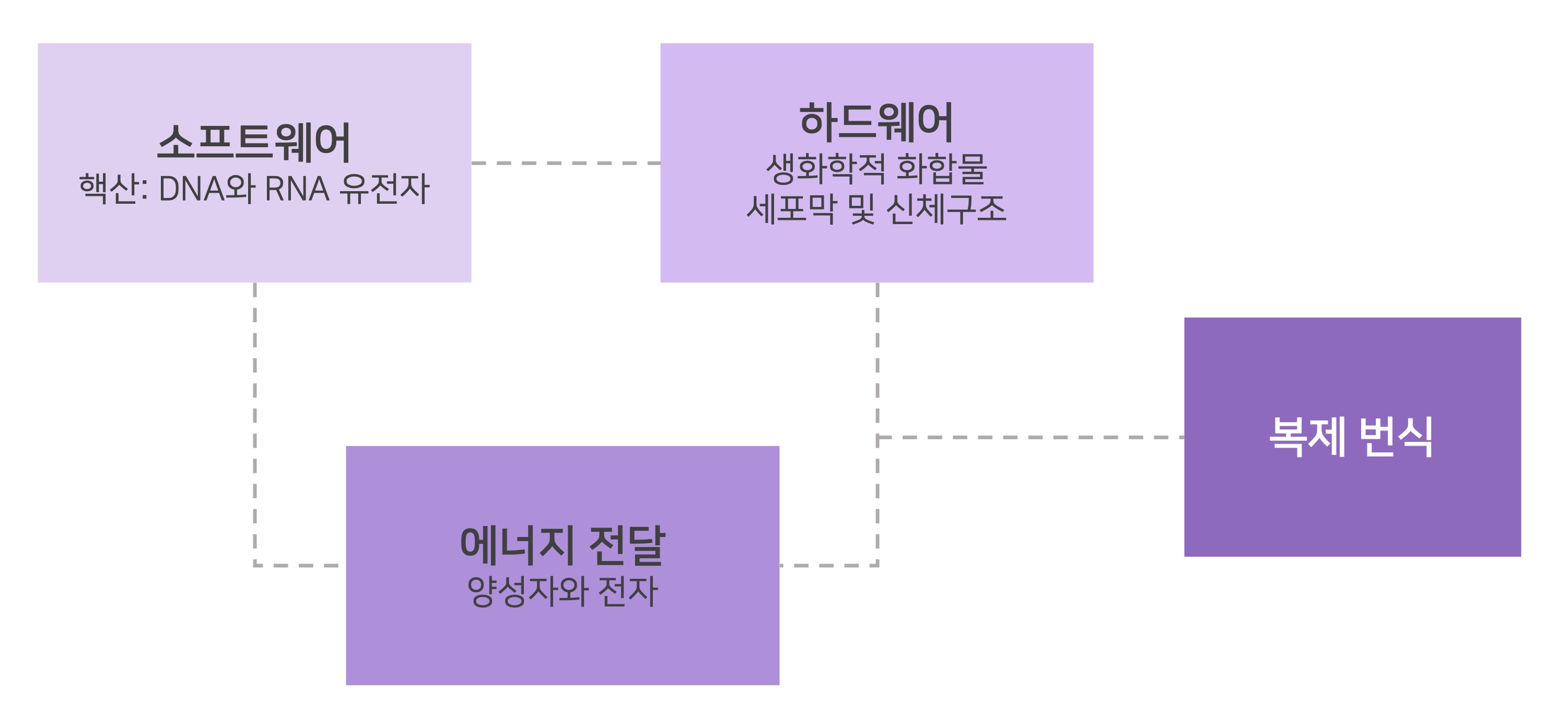 세포 복제로 생명을 유지하고 후세로 하드웨어와 소프트웨어를 전달한다.