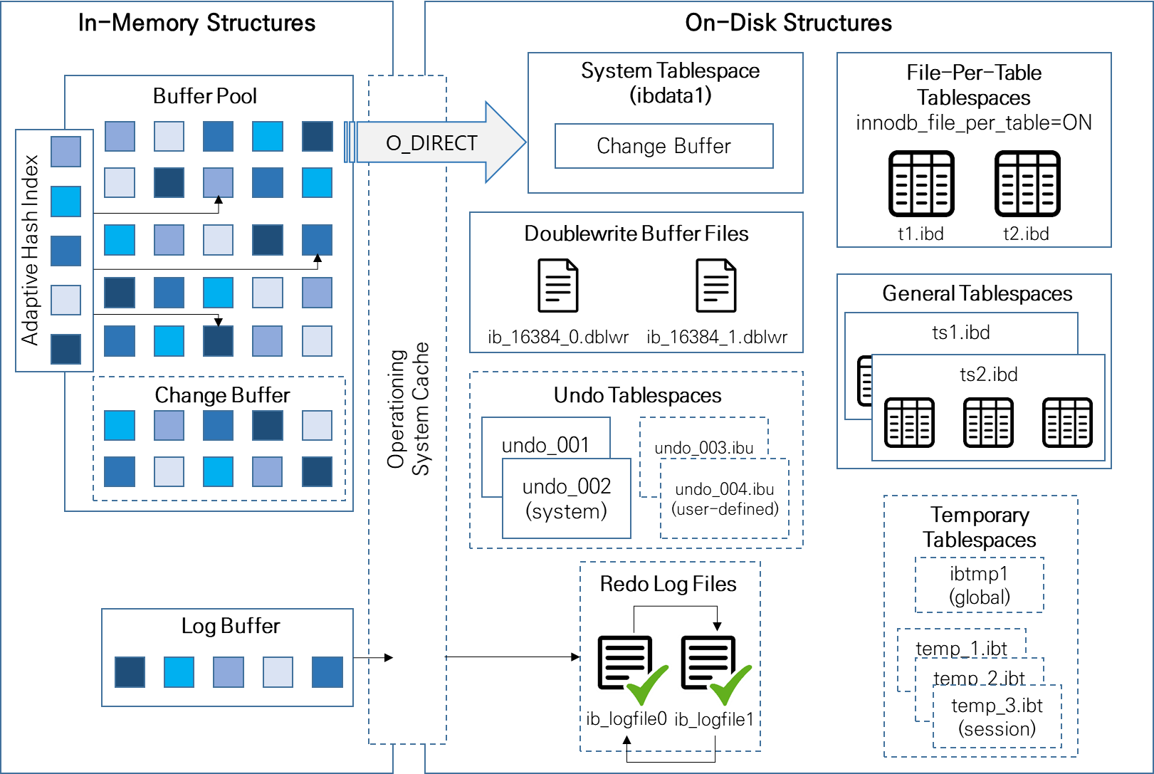 - InnoDB의 핵심 특징은 Buffer Pool의 존재입니다. Oracle의 Buffer Cache와 마찬가지로 디스크 상의 Data 파일이나 인덱스 정보를 메모리에 캐시 해두기 위한 공간입니다. 변경된 Data를 모아서 처리하기 때문에 디스크 I/O 횟수를 줄일 수 있습니다.