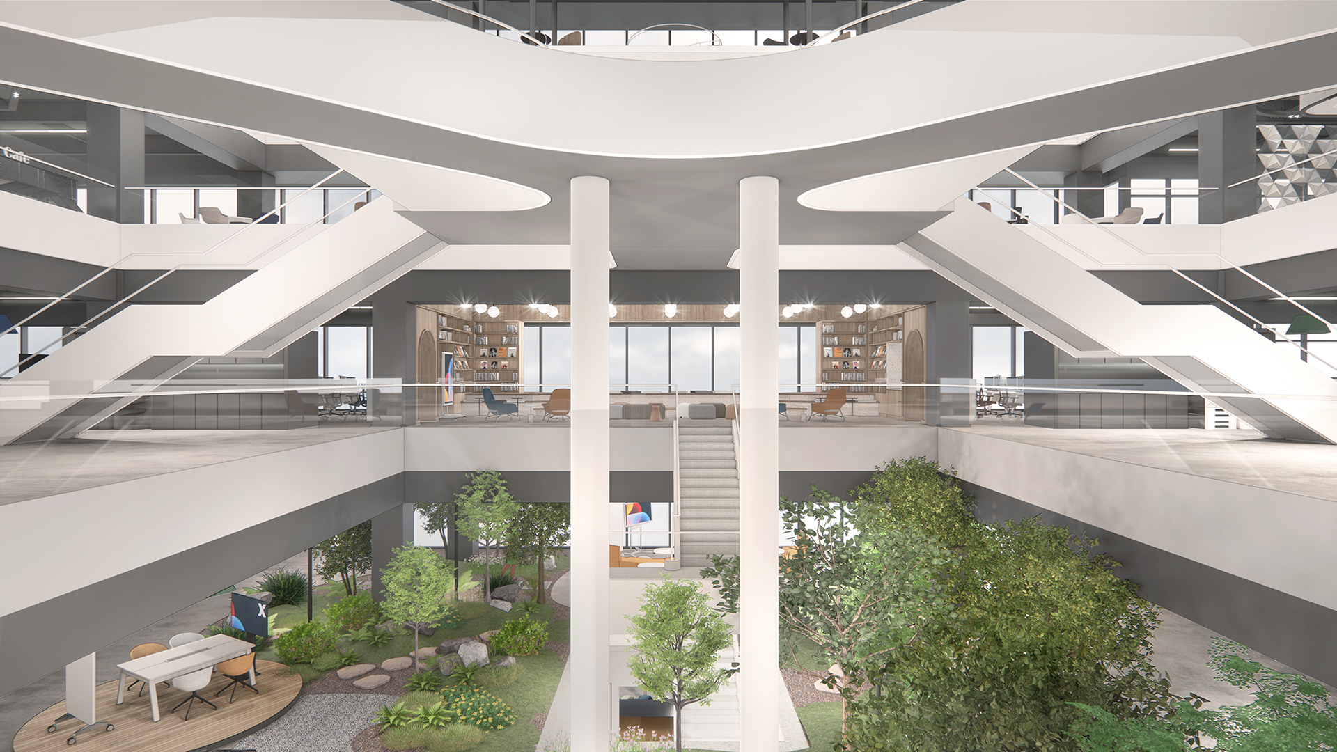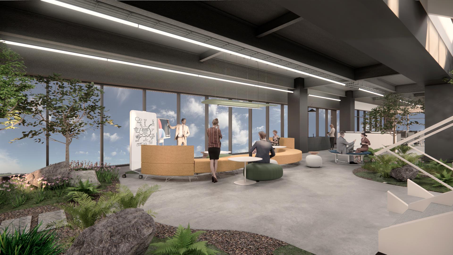 매우 놀라웠던 것은 휴게 공간이 요소요소 포인트가 아닌, 공간 전체에 녹아져 있다는 것입니다. 개발본부가 일하게 될 4층은 가칭 ‘Data 포레스트’라고 불리는 실내 정원이 메인으로 조성되고, 직원들은 숲에 둘러싸인 느낌을 받게 될 것입니다. 윗 층에서 아래를 내려보면 역시 숲의 전경을 볼 수 있습니다. 수면실, 수유실은 기본, GX룸, 게임 존, 직원 식당을 자유롭게 이용 가능하며, 화장실을 이용하는 동안에도 탁 트인 뷰를 감상할 수 있습니다. 곳곳에 직원을 배려한 포인트가 자리잡고 있습니다.