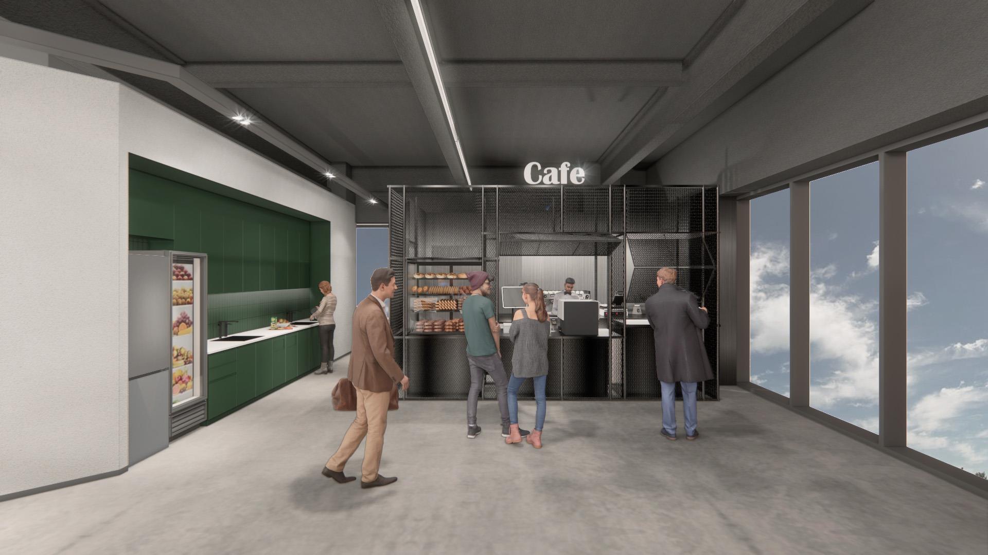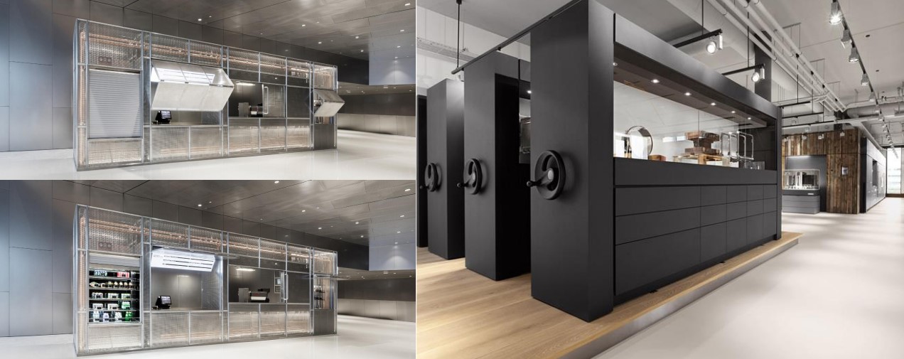 바리스타가 내려주는 맛있는 커피를 마시게 될 공간, 업무 시간 중에는 카페, 업무가 끝나면 큐브박스로 변신합니다. 모노톤을 유지하면서 메탈 소재를 사용해서 사이버틱한 느낌을 줍니다.