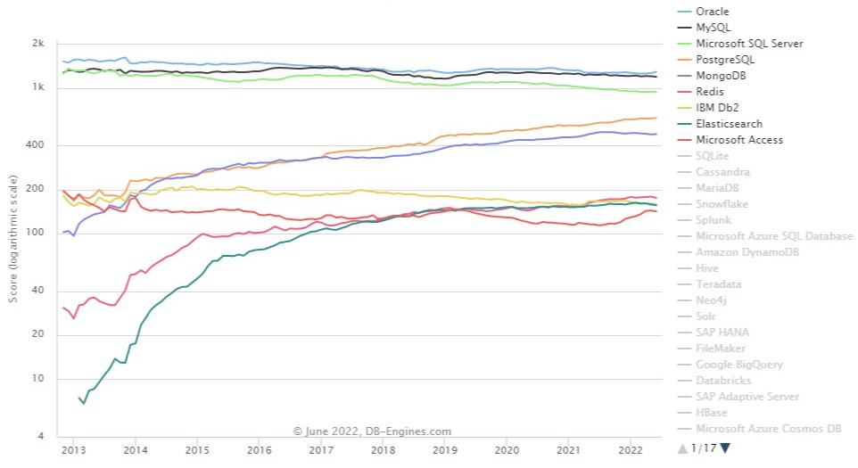 이러한 오픈소스 DBMS 진영의 약진 중 단연 눈 여겨 봐야 할 부분은 PostgreSQL의 성장 추세이다. 그간 오픈소스 DBMS분야에서 절대적 1위를 차지하던 MySQL의 위치를 위협하며 꾸준히 점유율이 증가하고 있기 때문이다.