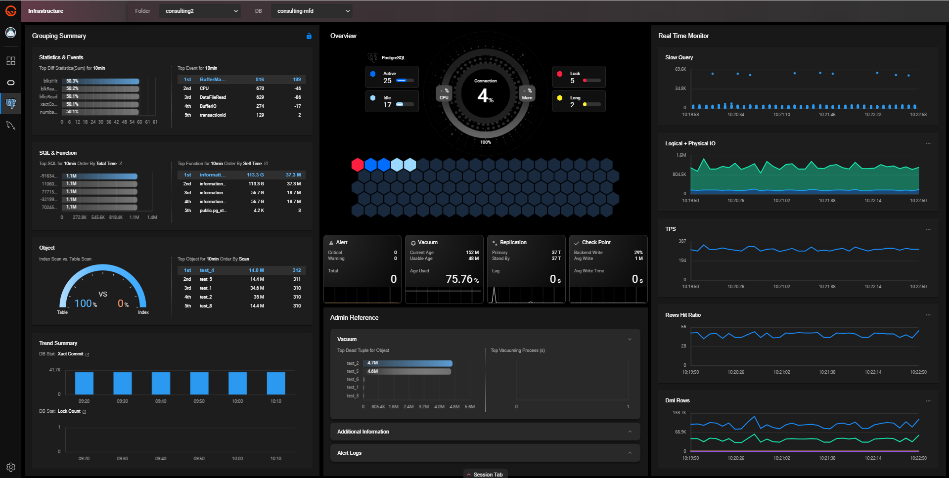 - Vacuum 관련, age, dead tuple 모니터링 및 문제가 되는 오브젝트와 세션을 실시간 분석하여 Top List로 제공