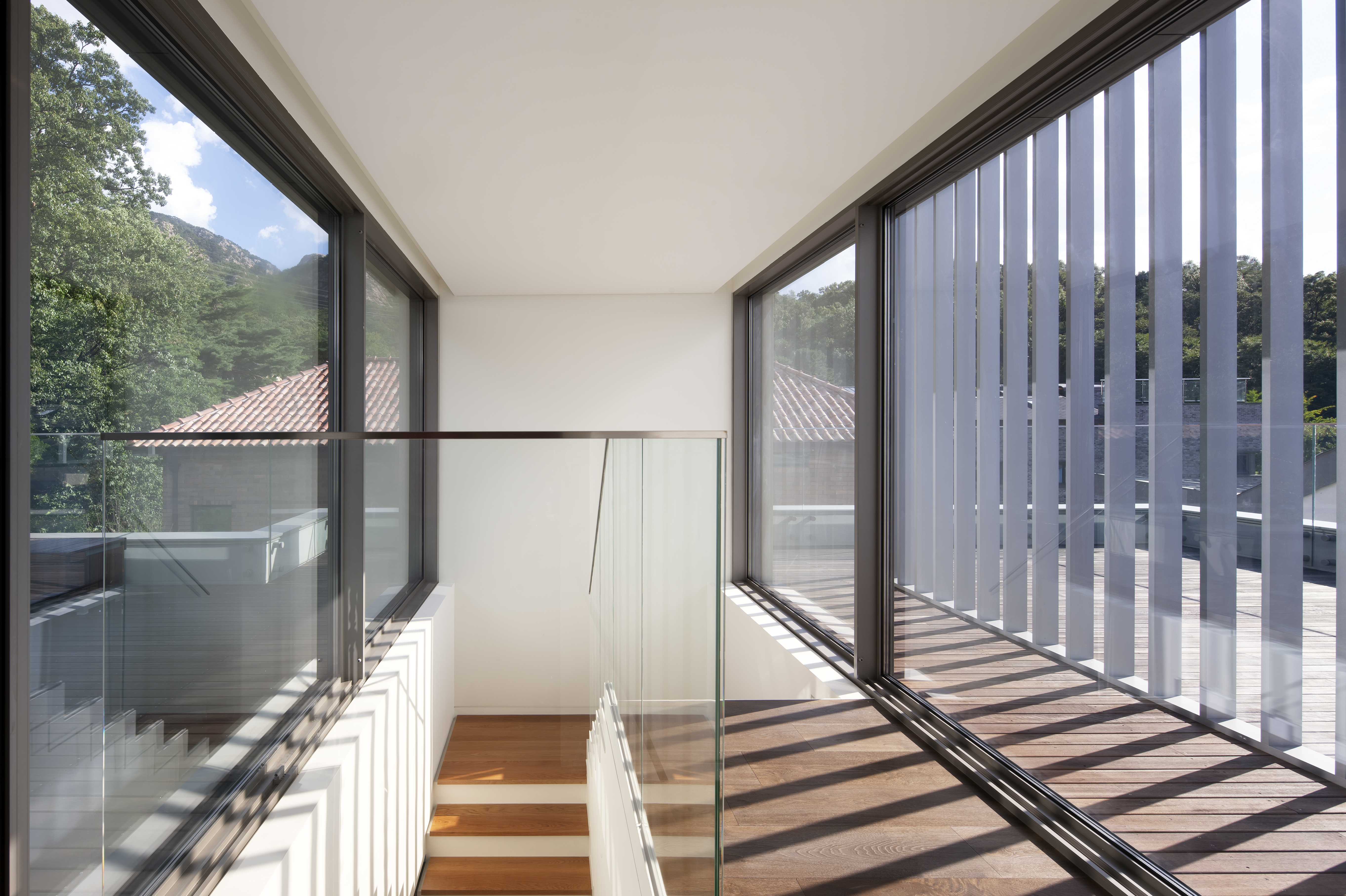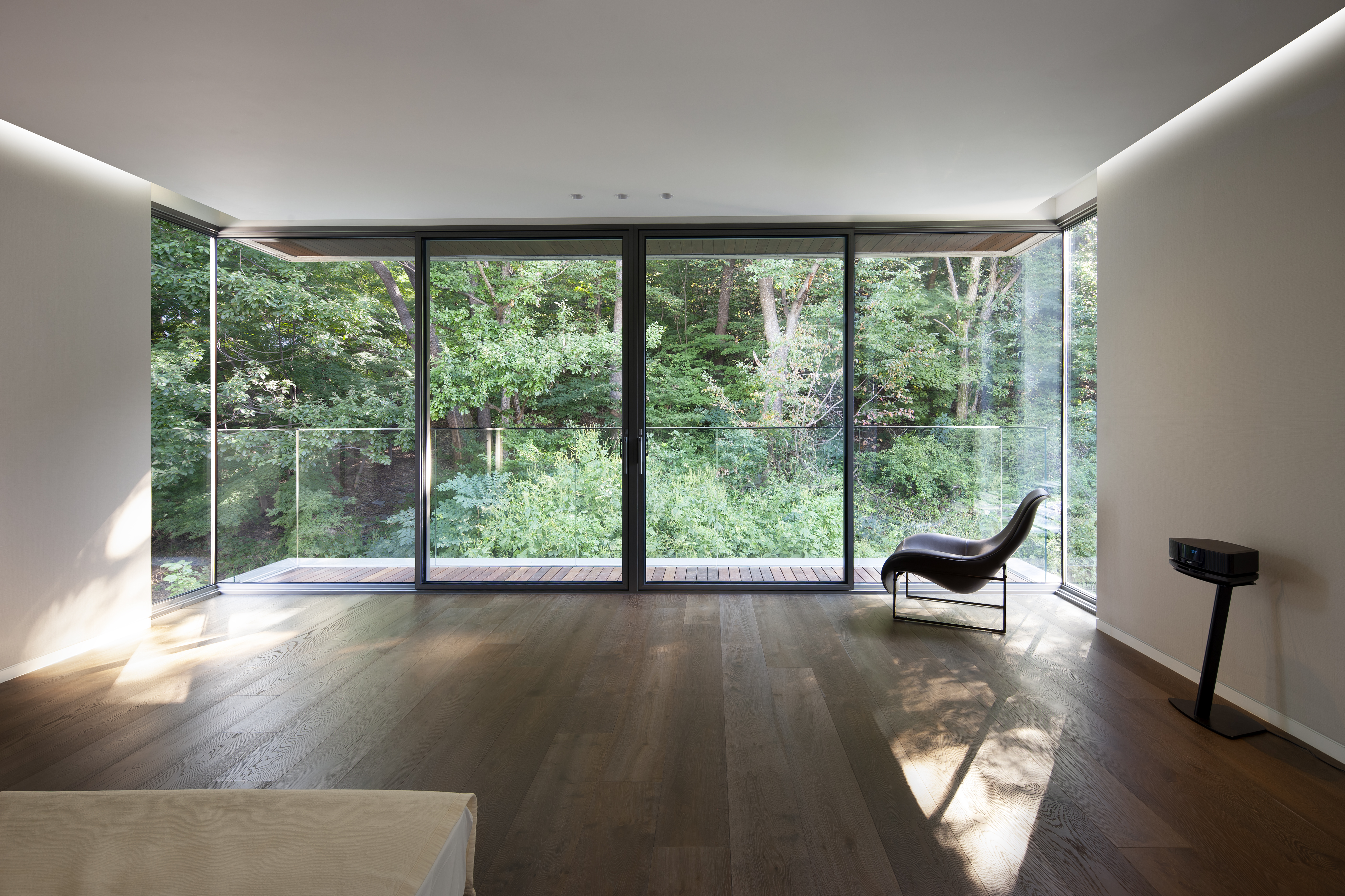 고즈넉한 위치 때문에도 그렇지만, 안으로 들어서면 더욱 더 자연과 가깝게 느껴집니다. 별채로 넘어가는 2층의 브릿지와 복도까지도 유리 소재를 사용해서 그 투명함 때문에 더욱 외부와 내부가 연결된 듯한 느낌을 줍니다. 건축가가 이곳에선 하늘과 숲이 집으로 흘러 들어 오는 것 같다는 표현을 했듯 말입니다. 그래서 공간 내부에 있는 사람이 자연과 적극적으로 소통할 수 있게 합니다. 이 곳은 온전한 쉼을 기대하게 됩니다.