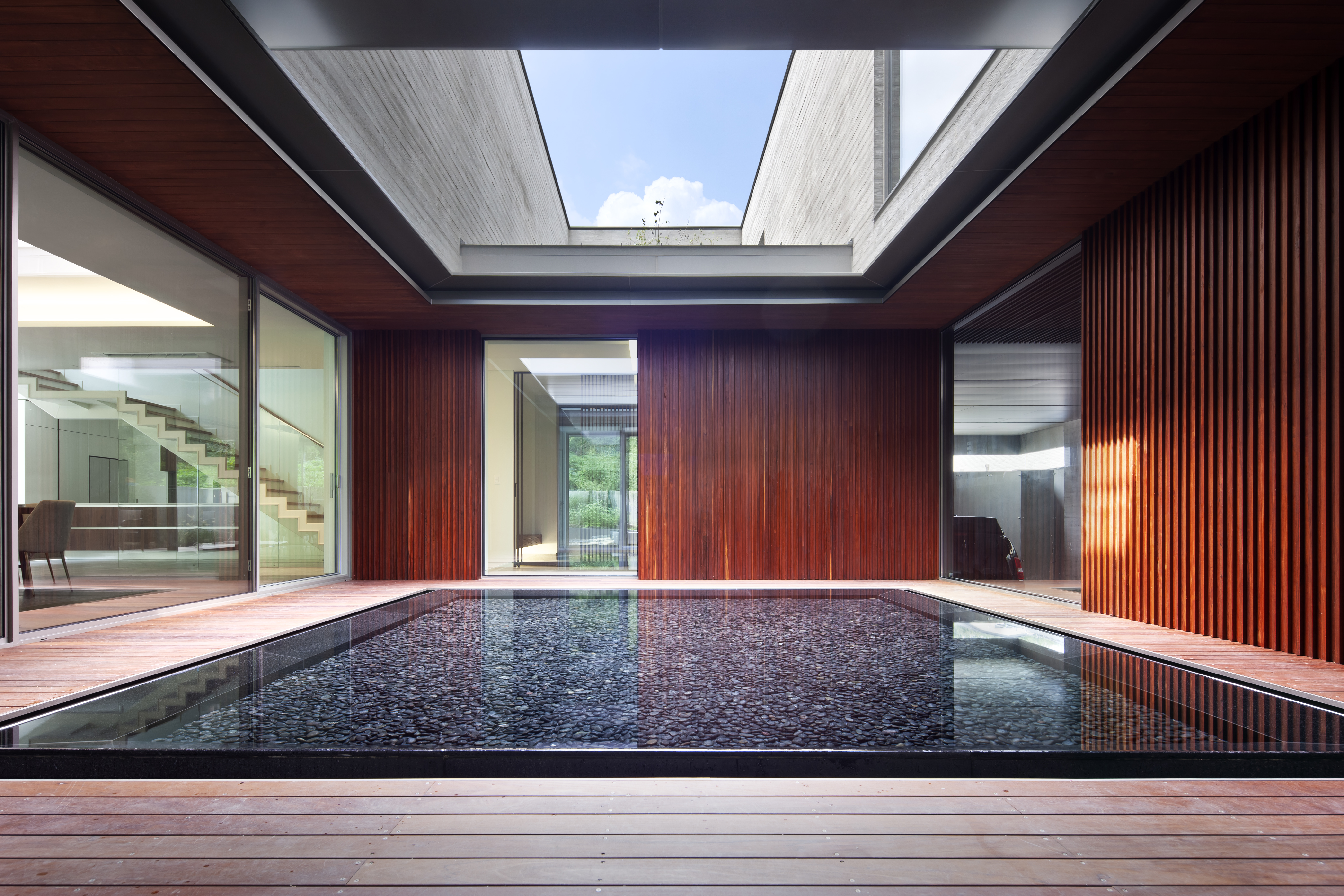 필인 하우스 중정의 수조는 마치 인피니티 풀 같습니다. 마루와 수조의 경계의 모호함 때문일까요? 수조의 바로 위는 천장을 뚫어 하늘과 맞닿게 했습니다. 비가 오면 수면은 방울을 튀기고, 바람이 불면 일렁입니다. 맑은 날에는 하늘을 반사합니다.