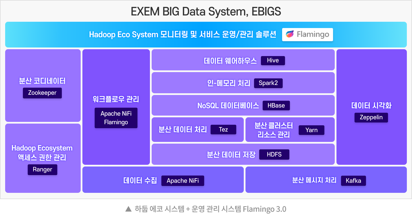 조금 더 자세히 살펴보면, EBIGS는 오픈소스 소프트웨어의 호환성을 검증해 하둡 에코시스템의 맞춤 구성과 설치, 모니터링을 넘어 운영 관리까지 지원하는 아파치 하둡 기반 빅데이터 플랫폼입니다.