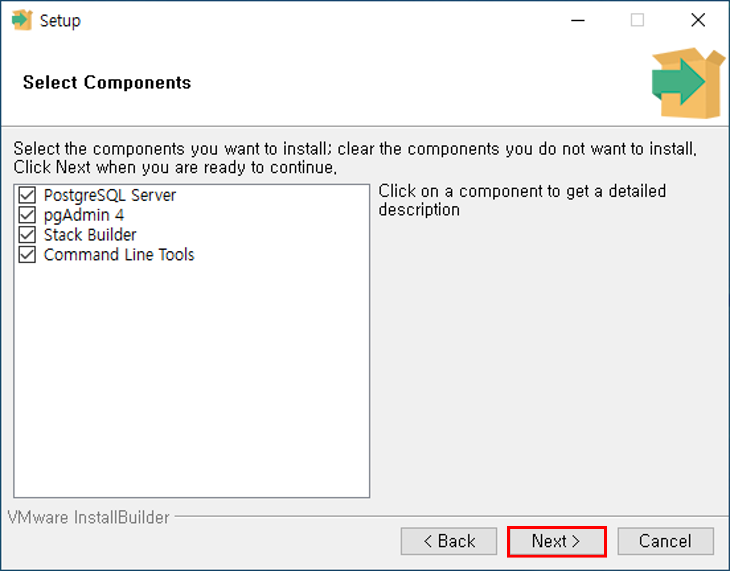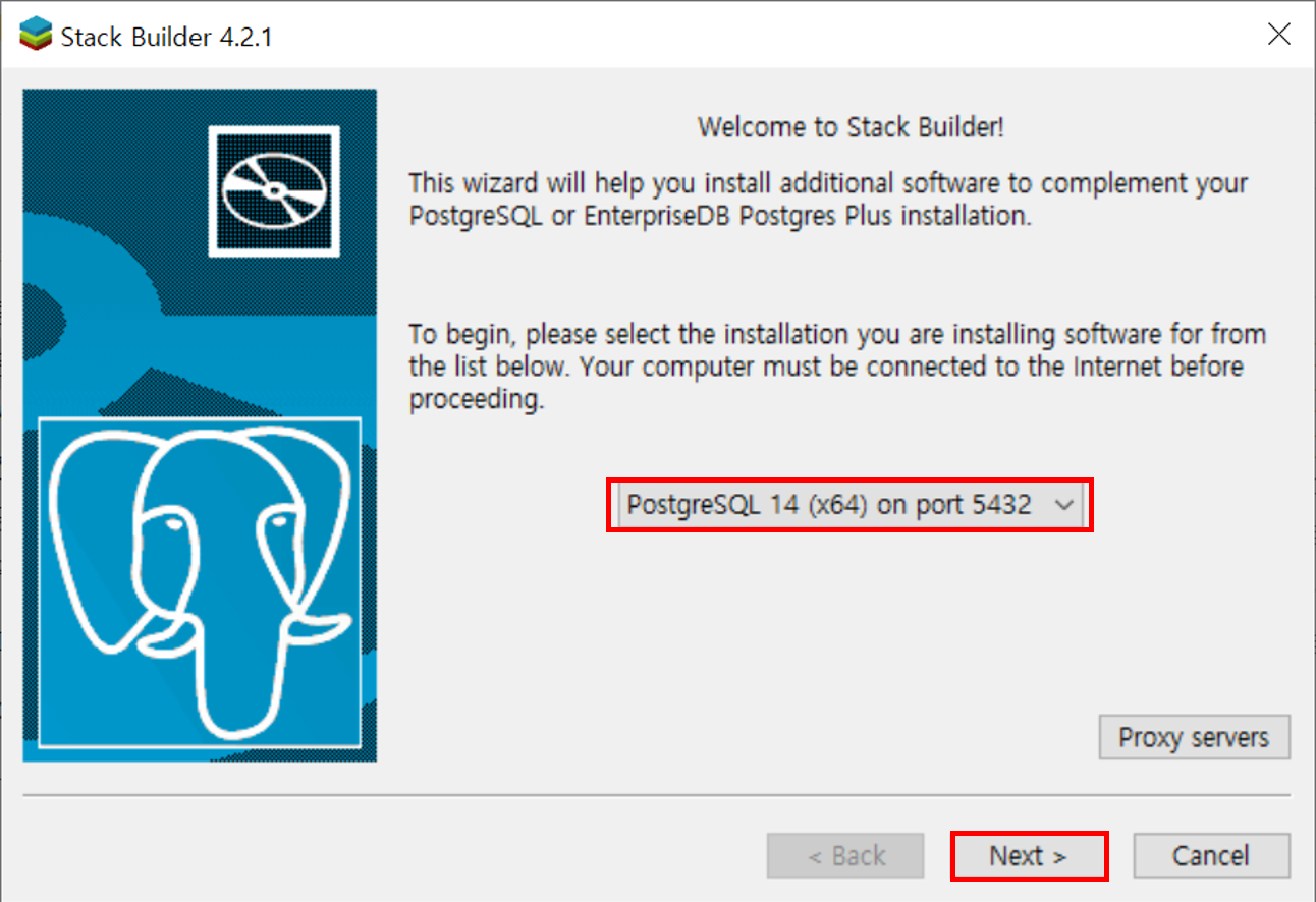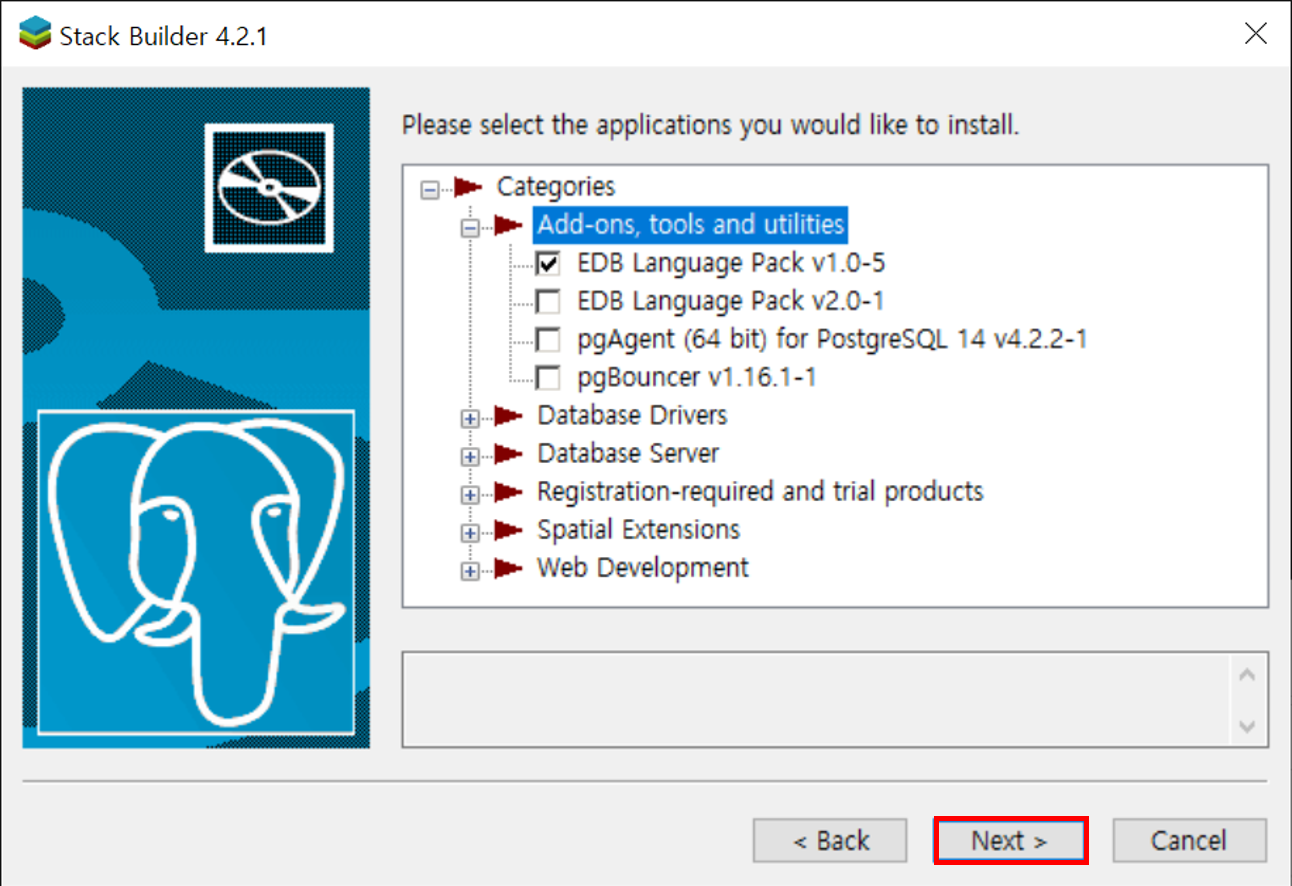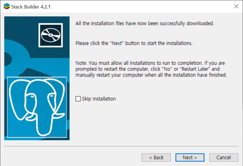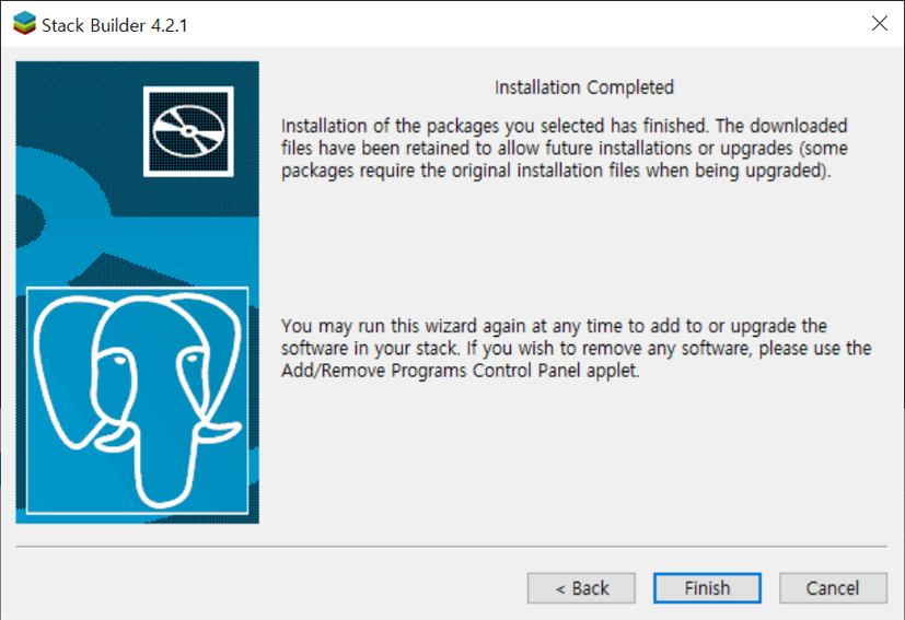 PostgreSQL 설치 마지막 단계 "Completing the PostgreSQL Setup Wizard"에서 Stack Builder 설치를 체크하고 종료하게 되면, Stack Builder에 포함된 추가 모듈을 설치할 수 있습니다.