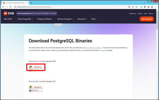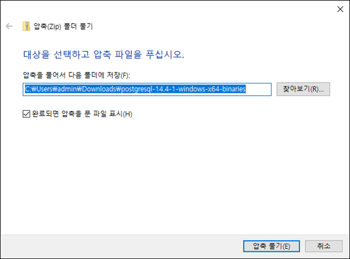 설치하고자 하는 PostreSQL 버전 설치 파일을 설치관리자 GUI를 통해 몇 번의 클릭만으로 설치할 수 있습니다. - binary File(Zip Archive)를 통한 설치
