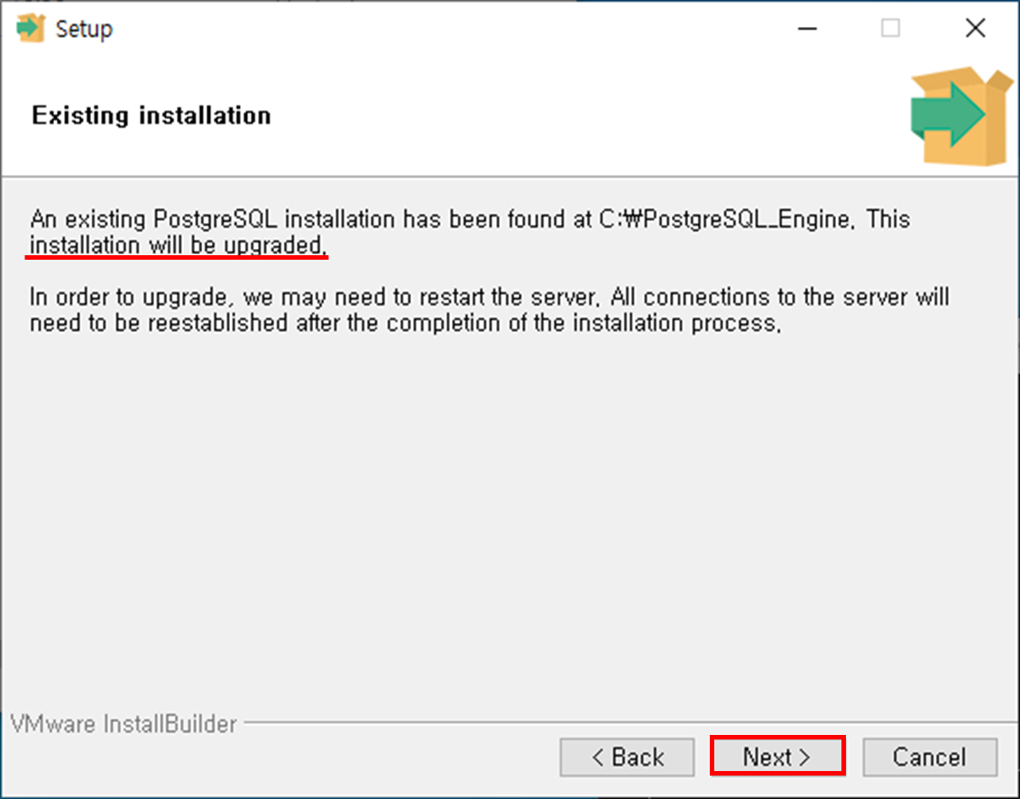 Step 3. 기존에 설치된 PostgreSQL이 존재하며, 이를 Upgrade 할지 여부 확인. Next 버튼 클릭
