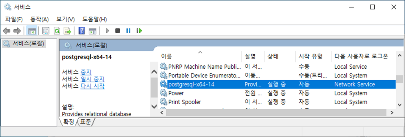 postgresql-x64-14 서비스가 잘 시작되었습니다.