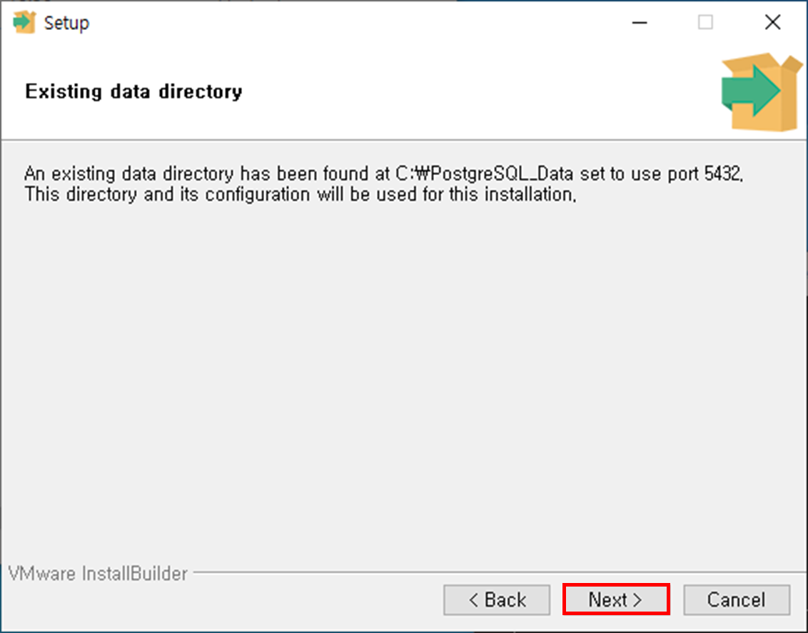 Step 4. 기존에 사용중이던 PostgreSQL Data 경로 및 Port를 사용할 건지 확인. Next 버튼 클릭