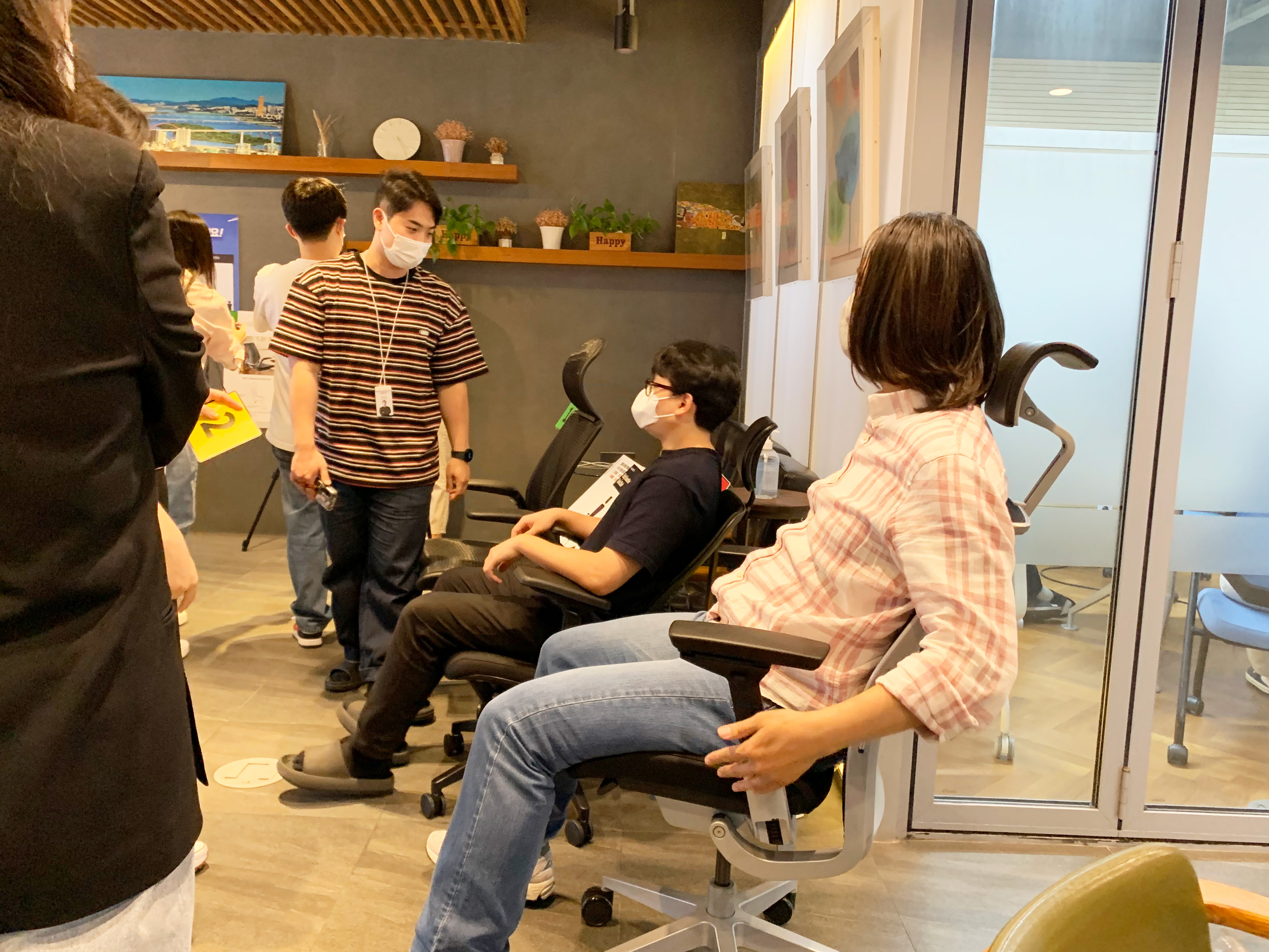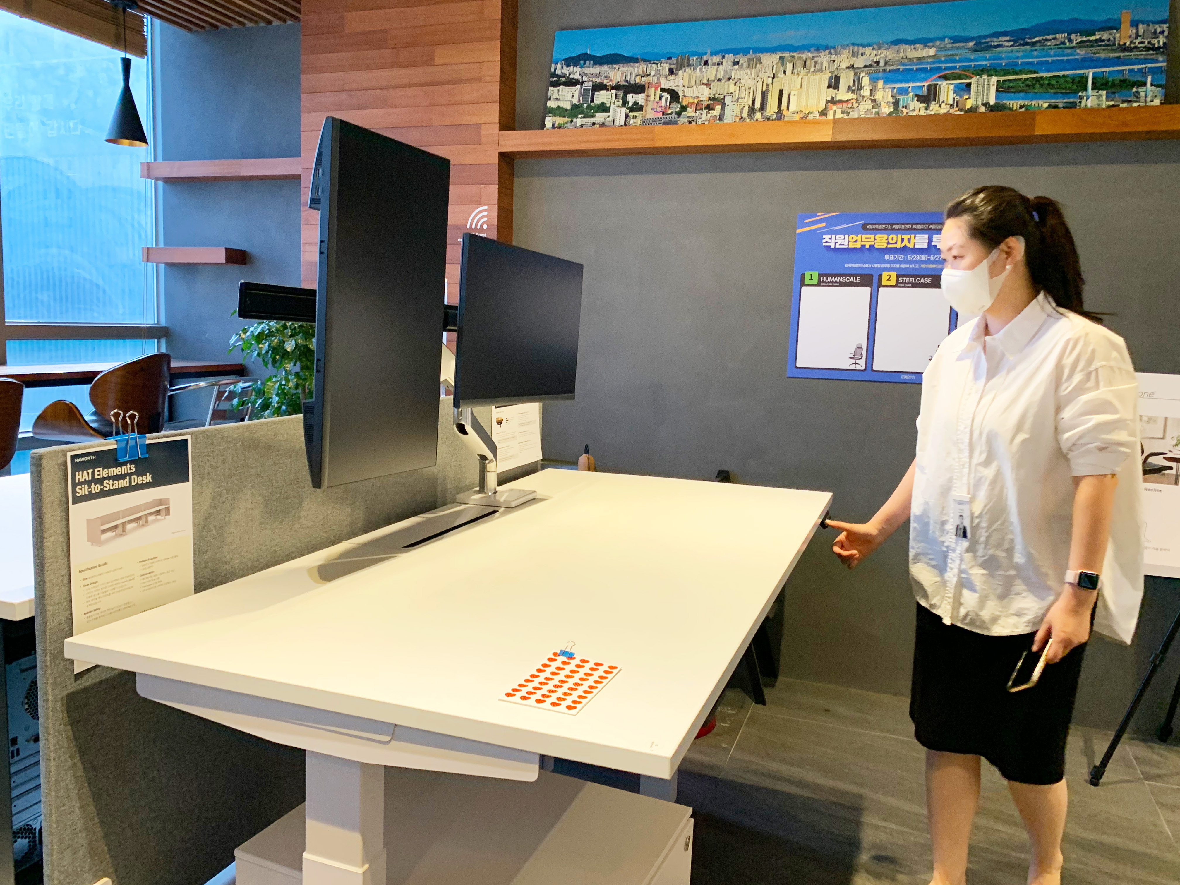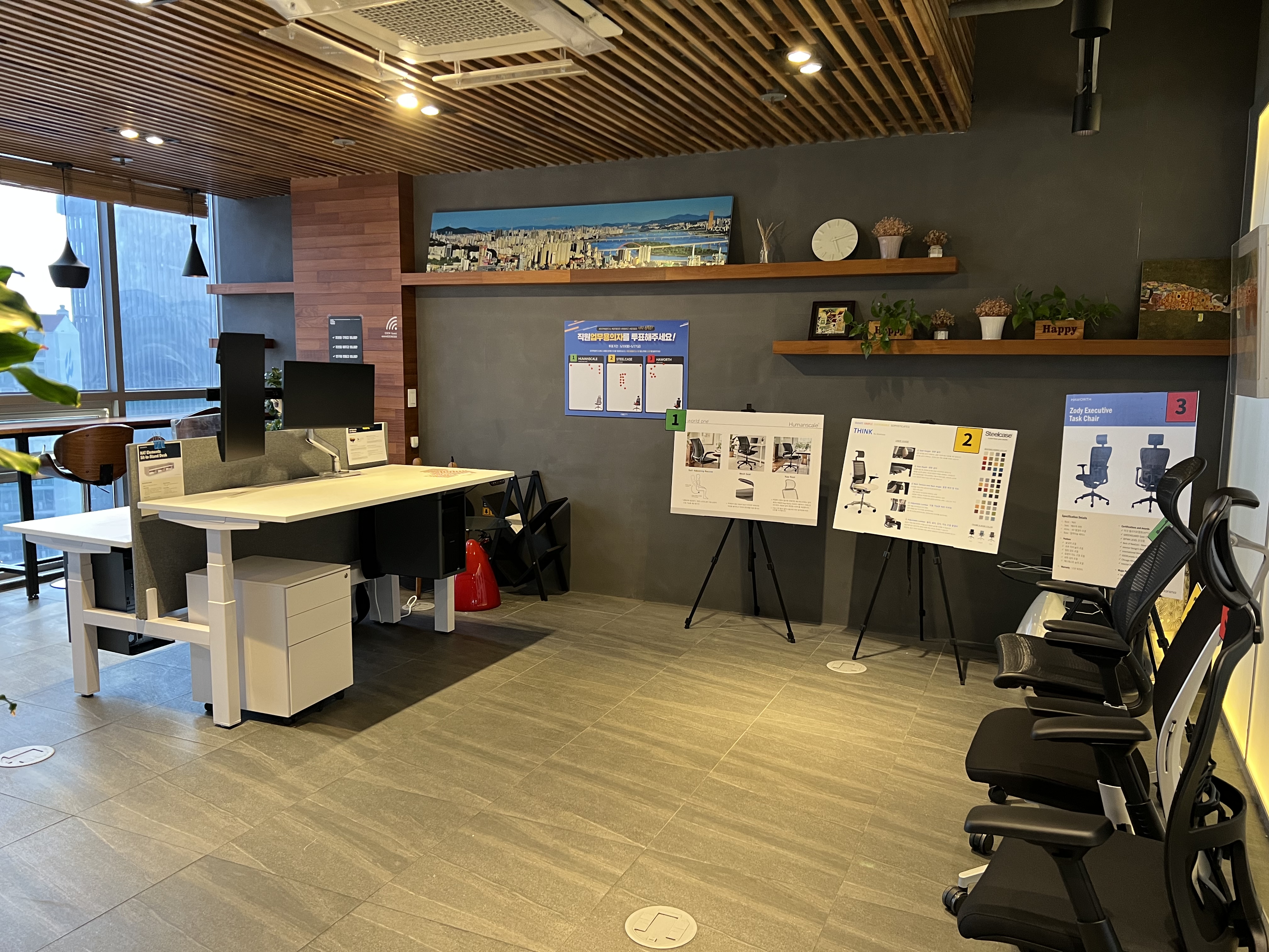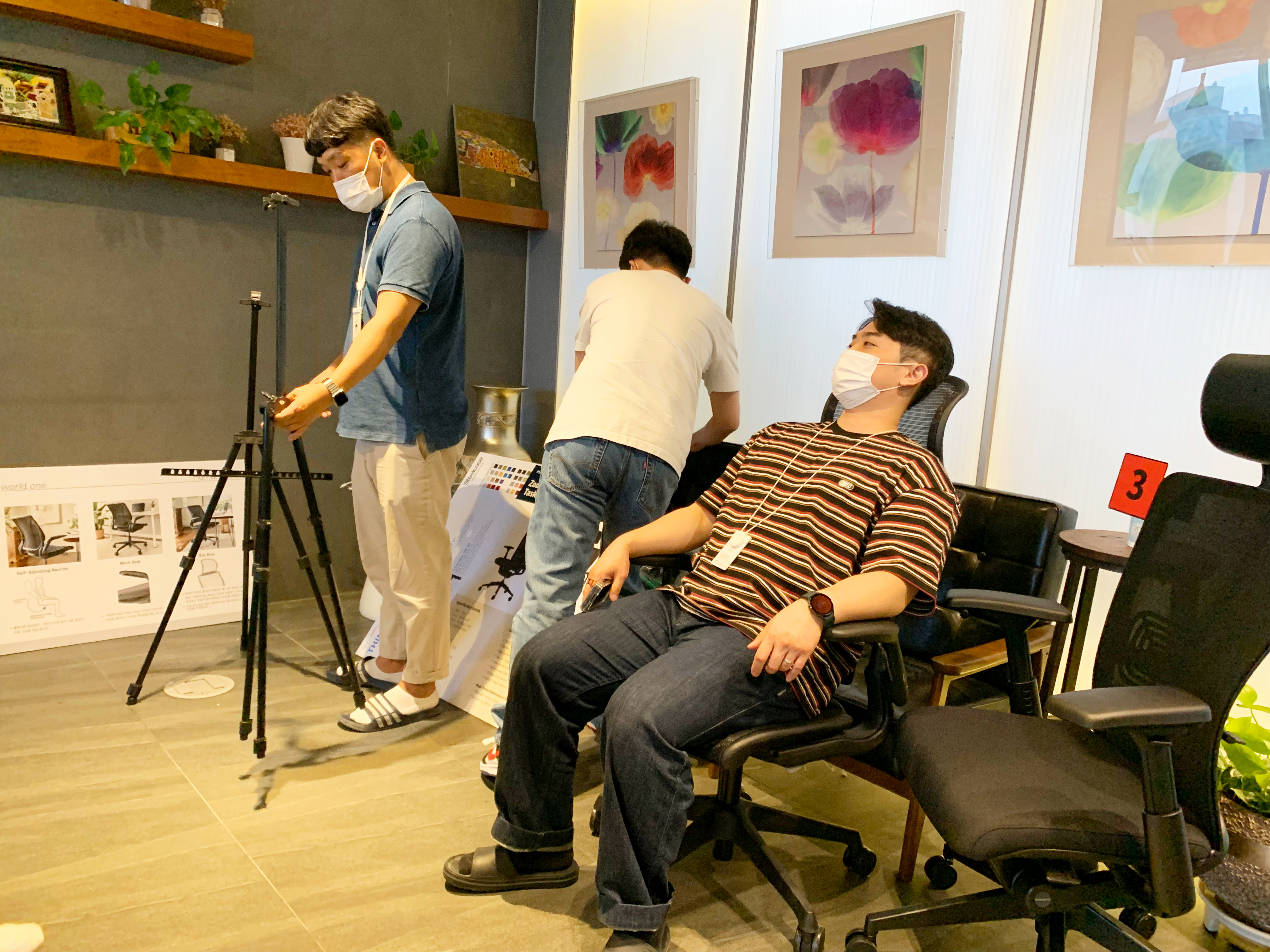 의자를 체험 후에 가장 마음에 드는 의자를 투표해서 집계 결과를 마곡센터에 반영하기로 했습니다. 5일간 임직원의 참여율은 80% 이상이었습니다. 사실 의자는 내 몸에 맞게 최적화되게 세팅하는 게 중요한 지라 많은 임직원들이 직접 사용하게 될 의자를 비교해 보며 신중하게 고민했습니다. 어떤 이는 체험 의자에 앉자마자 본인도 모르게 이렇게 말합니다. "이야~"