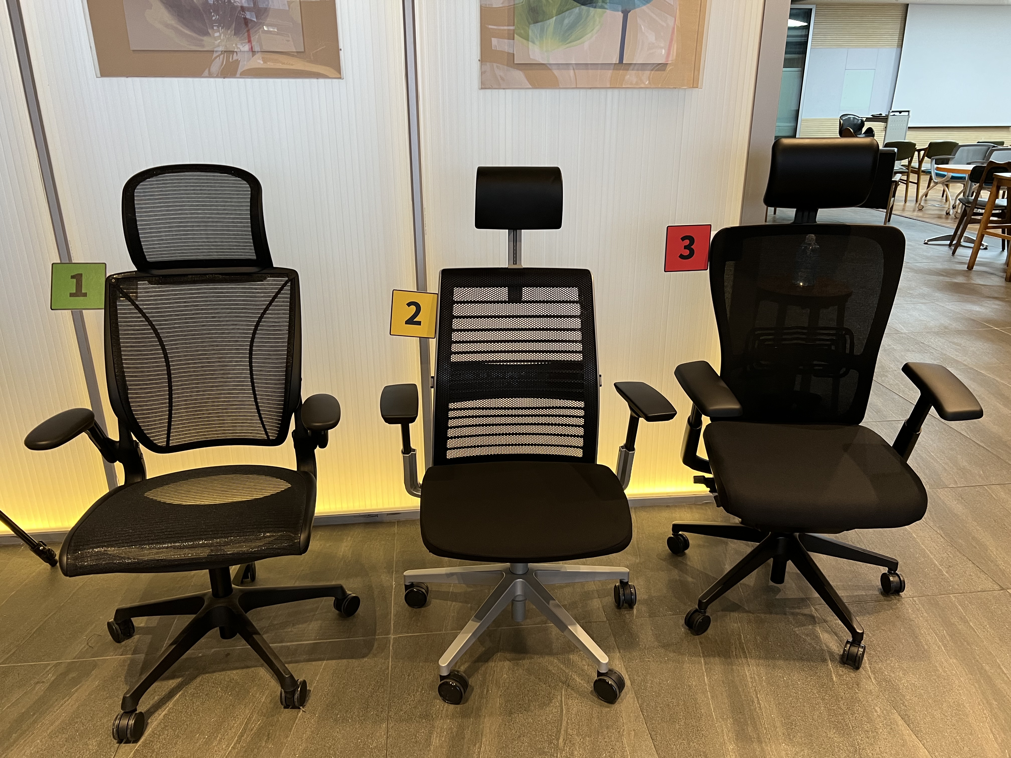 모션 책상에 맞춰 브랜드가 다른 3가지 종류의 의자를 충분히 체험할 수 있도록 했습니다. 후보 의자들 모두 기본적으로 등받이나 팔걸이, 좌석 깊이, 헤드레스트 등의 조절이 가능하며 브랜드 인지도와 신뢰가 높은 하이 레벨의 의자입니다. 아~~~무리 비싸고 좋은 의자라고 해도 나에게 맞지 않으면 좋은 의자가 될 수 없겠죠.