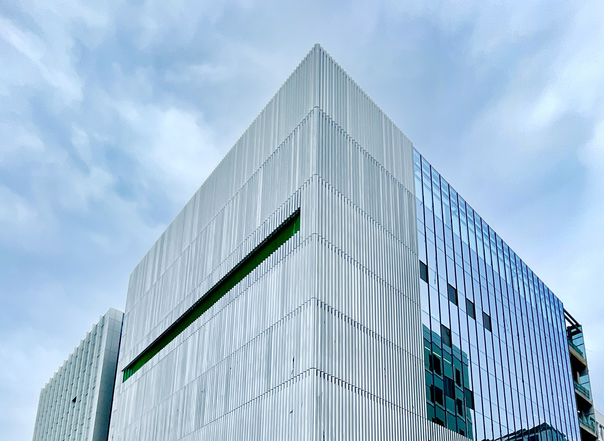 겉모습은 알루미늄 소재의 폭이 좁은 판을 일정 간격을 두고 배열한 것처럼 보이지만 자세히 들여다보면 이 또한 빛 계획이 있었습니다. 사전에 태양 시뮬레이션을 통해 서향의 일조가 많을 것으로 판단했고, 블라인드를 내려 공간을 답답하게 두고 싶지 않았습니다. 업무 환경의 단점을 해소하고자 루버(판을 일정 간격을 두고 배열한 것)의 방향을 45도로 틀었고, 이를 통해 서측 일사는 차단하고 북서쪽 시야는 확보하게 한 것입니다. 45도 틀어진 루버는 조망점에 따라 개방감이 달라지는 다채로운 모습을 보여줍니다. 그래서 엑셈 마곡센터는 표정이 많은 건물, 빛의 흐름을 담은 건물이라는 느낌을 줍니다. 정면에서 보이는 6층은 마치 극장의 무대처럼 열리고 닫힙니다. 일정한 시간이 되면 음악과 함께 리듬을 가지고 안으로 접혀 올라가며 깊은 처마의 모습을 하게 될 것입니다.