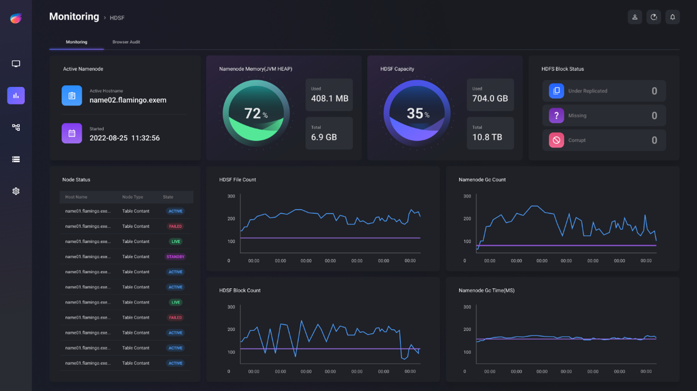 HDFS Monitoring 메뉴는 Active Namenode, Data Node, JVM Heap 및 HDFS 사용량 등의 핵심 정보를 제공합니다.