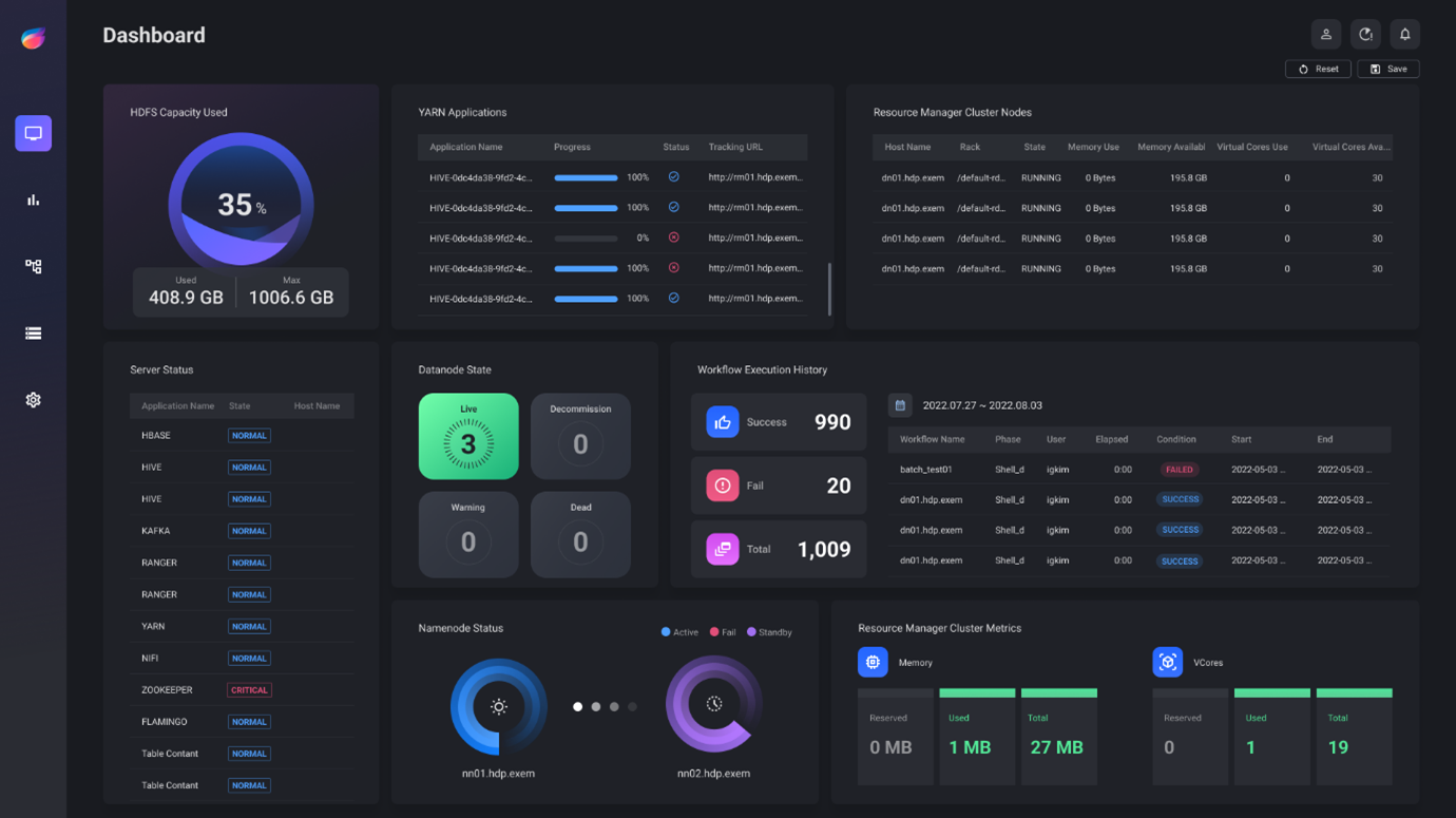 Dashboard view를 통해 Hadoop Cluster의 핵심 지표를 제공하며 각 노드의 자원 및 상태 정보를 제공합니다.