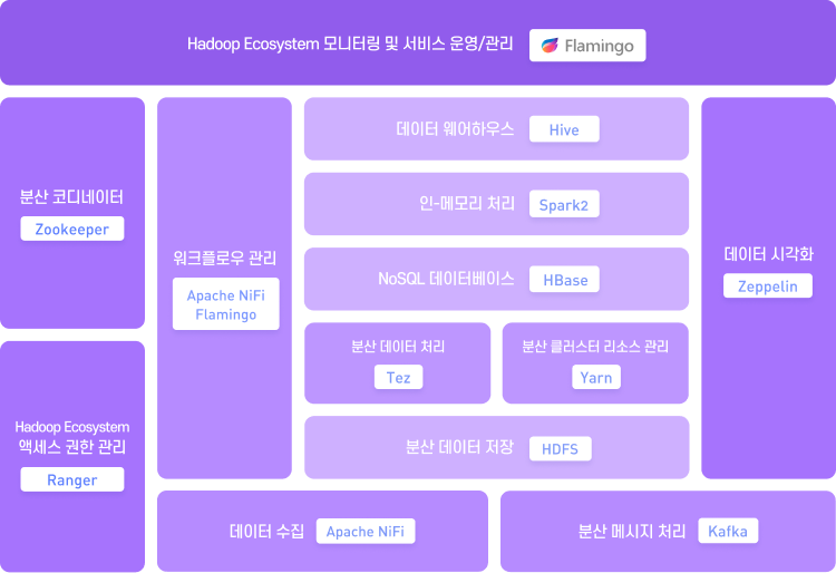 위 그림과 같이, EBIGs는 Hadoop, Hive, Spark, Zookeeper, HBase, Nifi 등으로 구성되어 있는 Hadoop Eco System을 자체 솔루션을 통해 관리합니다.