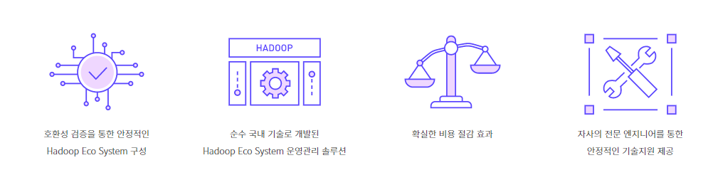 EBIGs는 이에 맞추어 비즈니스에 효율적으로 적용시킬 수 있는 Hadoop Eco System으로 구성하였으며, Hadoop Eco System의 운영관리, 보안 설정, 사용자 관리, 성능 모니터링 등의 다양한 기능을 제공하고 있답니다.